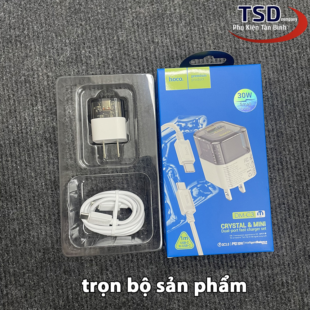 Hoco DM-C3 là phiên bản bộ sạc trong suốt mới nhất của nhà Hoco. Với công suất sạc lên đến 30W, củ sạc Hoco thích hợp để sạc cho các thiết bị từ điện thoại di động cho đến máy tính bảng. Không những vậy, phiên bản bộ sạc này còn được trang bị đến 2 cổng sạc là USB và Type-C để hỗ trợ sạc đồng thời hai thiết bị cùng lúc một cách dễ dàng. Bộ sạc cũng đi kèm dây cáp type-c chất lượng cao, cực kỳ tiện lợi để sạc các thiết bị theo nhu cầu của người dùng. Với những ưu điểm trên, đây chắc chắn là sự lựa chọn tuyệt vời cho những ai đang tìm kiếm một sản phẩm sạc điện thoại với mức giá phải chăng và khả năng sạc cho các thiết bị khác nhau một cách hiệu quả.