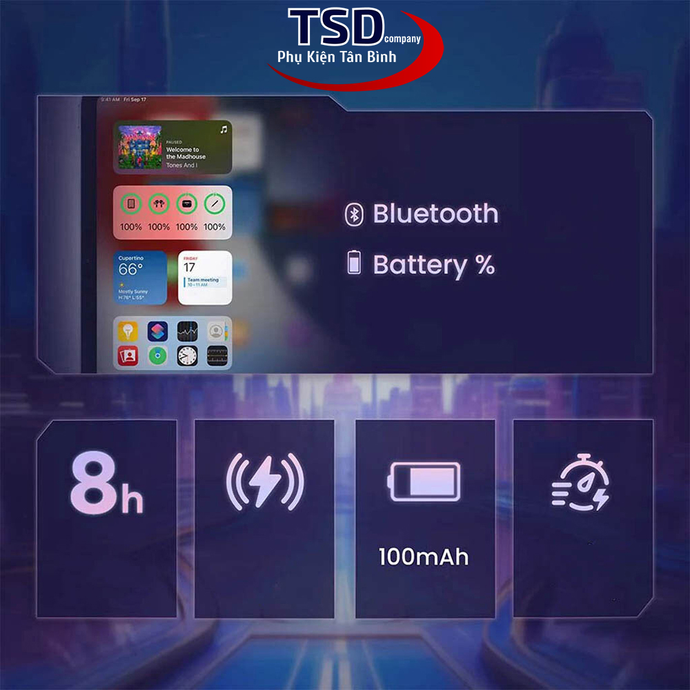 Viên pin tích hợp dung lượng 100 mAh giúp bạn sử dụng liên tục 8 tiếng.