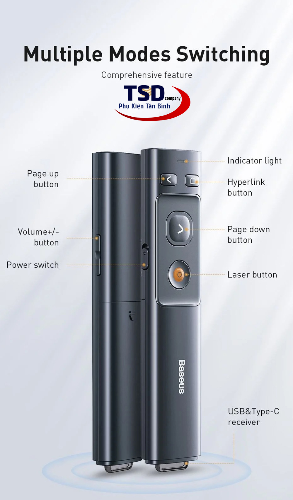 - Khác với các loại bút trình chiếu PPT thông thường, Baseus Orange Point là phiên bản hoàn toàn mới vinh dự nhận giải thưởng thiết kế Red Dot 2020, được trang bị cùng lúc 2 đầu USB, Type-C, hỗ trợ nhiều thiết bị hơn, không cần bộ chuyển đổi và các thiết bị khác. Từ đó người dùng có thể dễ dàng kết nối, điều khiển trong khoảng cách xa đến 100m với độ nhạy cao.