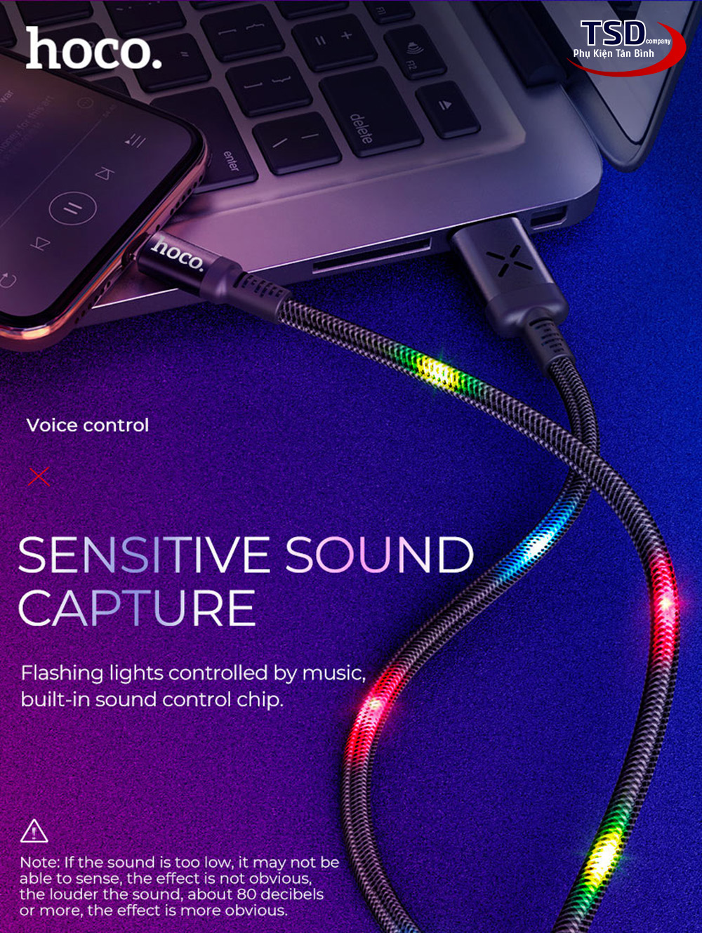 - Trên đầu cáp được trang bị 1 cảm biến âm thanh khi cáp phát hiện ra âm thanh cáp sẽ nhấp nháy nhìn rất đẹp. Cáp USB Hoco U63 phát sáng khi ta cắm đầu USB vào nguồn thì cảm ứng âm thanh hoạt động tức thì cỉ cần nghe âm thanh cáp lập tức phát sáng.