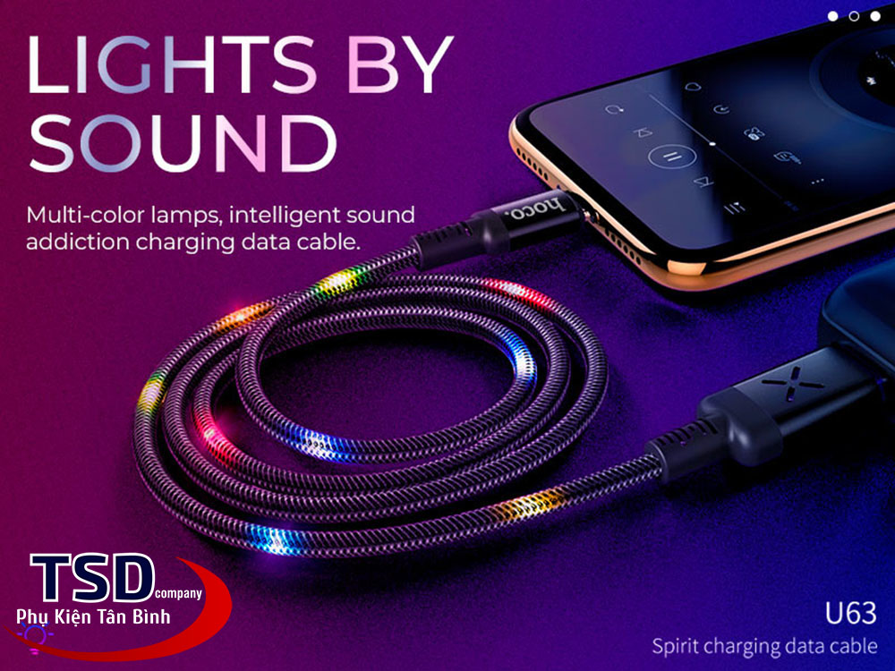 Trên đầu cáp được trang bị 1 cảm biến âm thanh khi cáp phát hiện ra âm thanh cáp sẽ nhấp nháy nhìn rất đẹp. Cáp USB Hoco U63 Micro phát sáng khi ta cắm đầu USB vào nguồn thì cảm ứng âm thanh hoạt động tức thì cỉ cần nghe âm thanh cáp lập tức phát sáng.