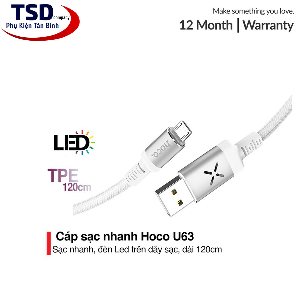 Cáp USB Hoco U63 hỗ trợ chuẩn sạc nhanh QC 2.0 cho dòng ra Max 2.4A. Chiều dài cáp 120cm.