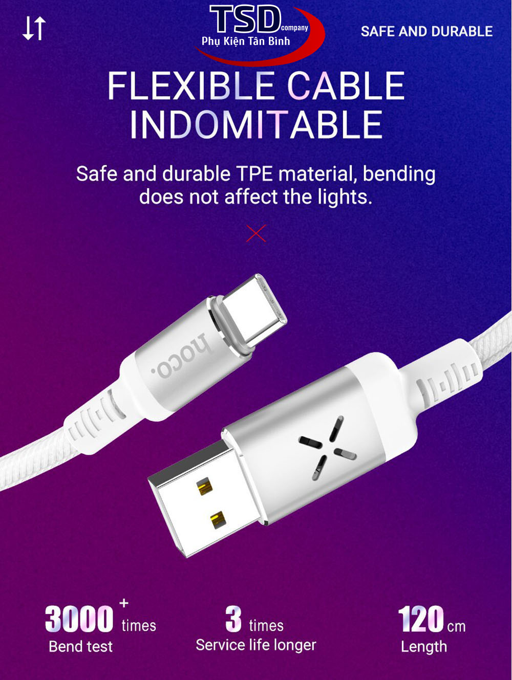 Trên đầu cáp được trang bị 1 cảm biến âm thanh khi cáp phát hiện ra âm thanh cáp sẽ nhấp nháy nhìn rất đẹp. Cáp USB Hoco U63 Type C phát sáng khi ta cắm đầu USB vào nguồn thì cảm ứng âm thanh hoạt động tức thì cỉ cần nghe âm thanh cáp lập tức phát sáng.