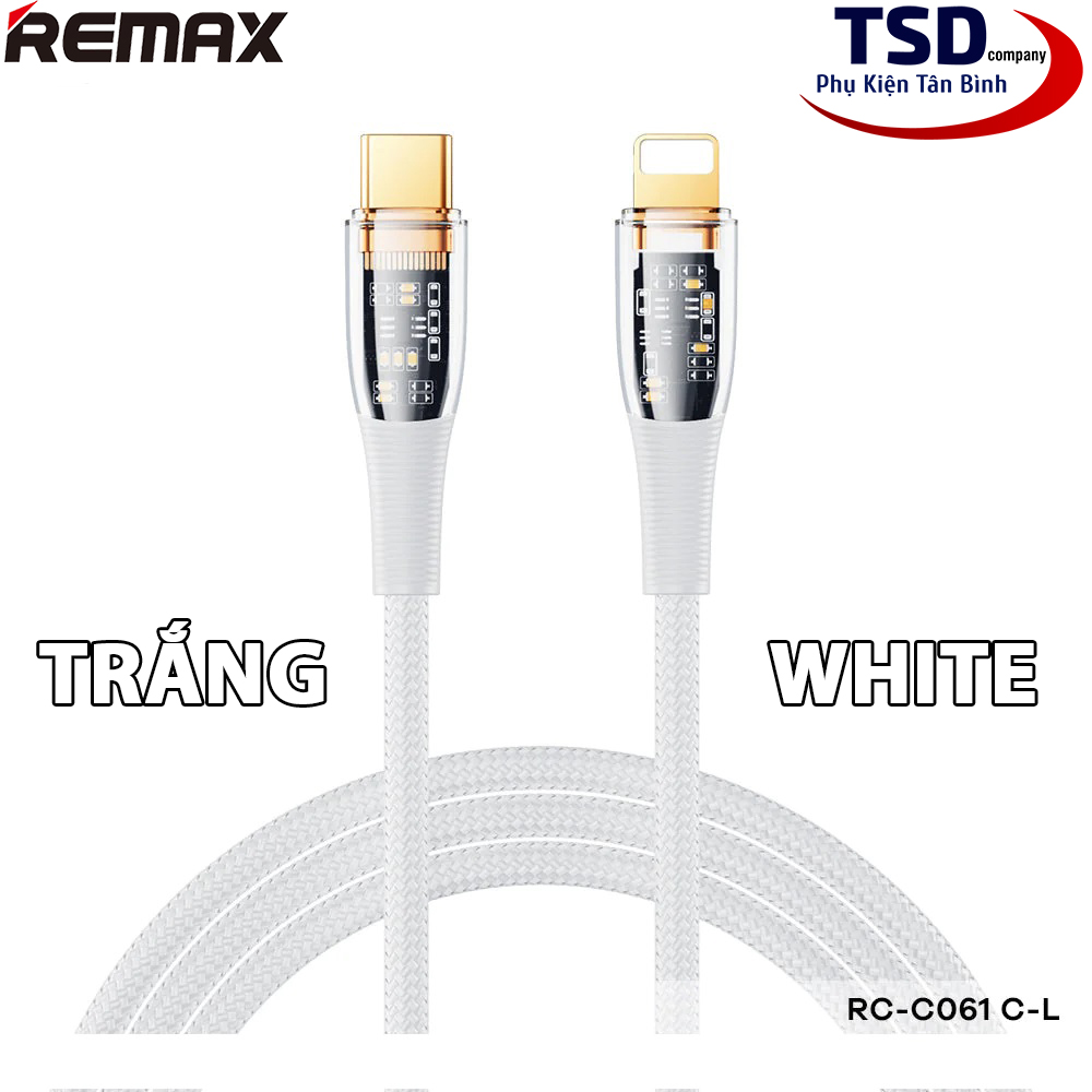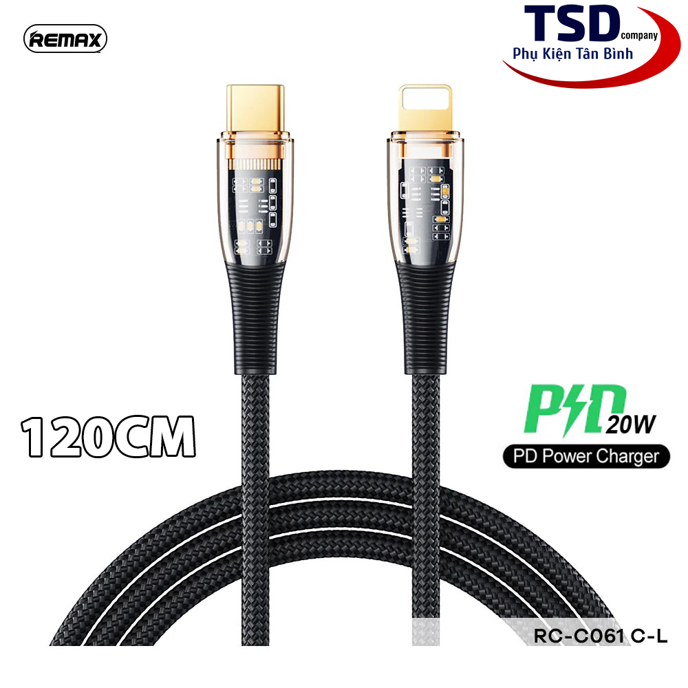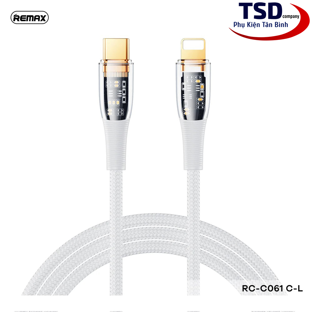 - Một lựa chọn hoàn hảo dành cho người dùng yêu thích những sản phẩm chất lượng với những thiết kế vô cùng mới lạ chính là Cáp Sạc Nhanh Type C to Lightning 20W Remax RC-C061. Khác biệt hoàn toàn so với những chiếc cáp truyền thống, Remax RC-C061 sở hữu thiết kế hai đầu “trong suốt”, lộ bảng mạch cực bắt mắt. Kết hợp thêm hai chân cắm Type C và Lightning được mạ vàng trông rất cao cấp và sang trọng.