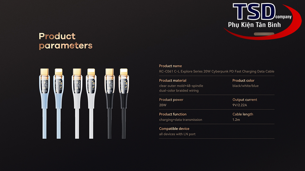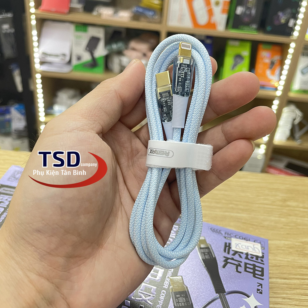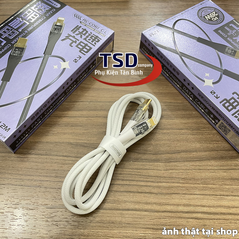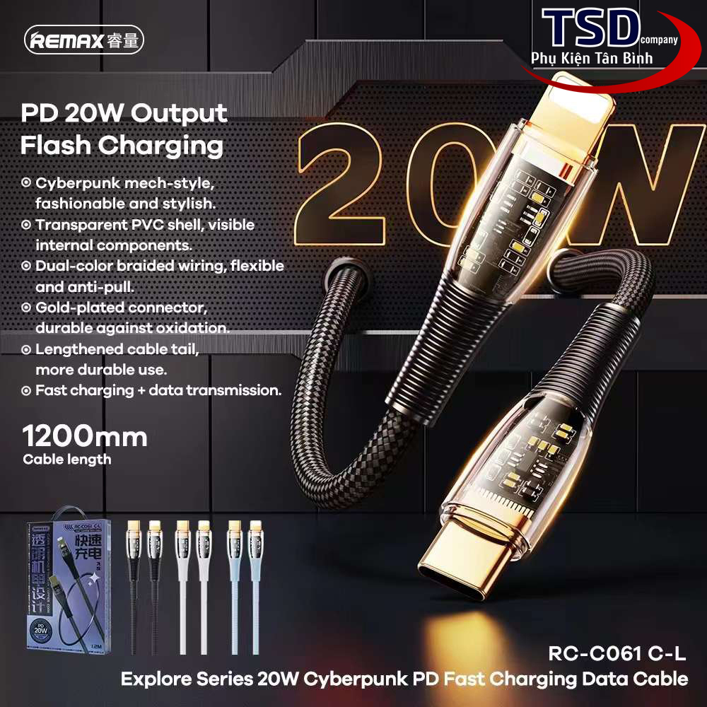 - Một lựa chọn hoàn hảo dành cho người dùng yêu thích những sản phẩm chất lượng với những thiết kế vô cùng mới lạ chính là Cáp Sạc Nhanh Type C to Lightning 20W Remax RC-C061. Khác biệt hoàn toàn so với những chiếc cáp truyền thống, Remax RC-C061 sở hữu thiết kế hai đầu “trong suốt”, lộ bảng mạch cực bắt mắt. Kết hợp thêm hai chân cắm Type C và Lightning được mạ vàng trông rất cao cấp và sang trọng.