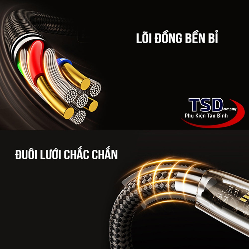 - Bên cạnh đó, nhà sản xuất còn gia cố thêm lớp cao su bảo vệ ở hai đầu cáp. Chúng được thiết kế kéo dài như đuôi cá, bao phủ mối nối giữa thân cáp và các đầu. Cáp đã được thông qua bài kiểm tra uốn cong tới hơn 5000 lần mà chất lượng sản phẩm vẫn được đảm bảo. Thiết kế này giúp gia tăng tuổi thọ sử dụng sản phẩm. Bên trong sợi cáp là các lõi dây đồng mạ thiếc dày dặn chất lượng cao giúp tốc độ truyền tải nhanh hơn, an toàn hơn và điện trở thấp.
