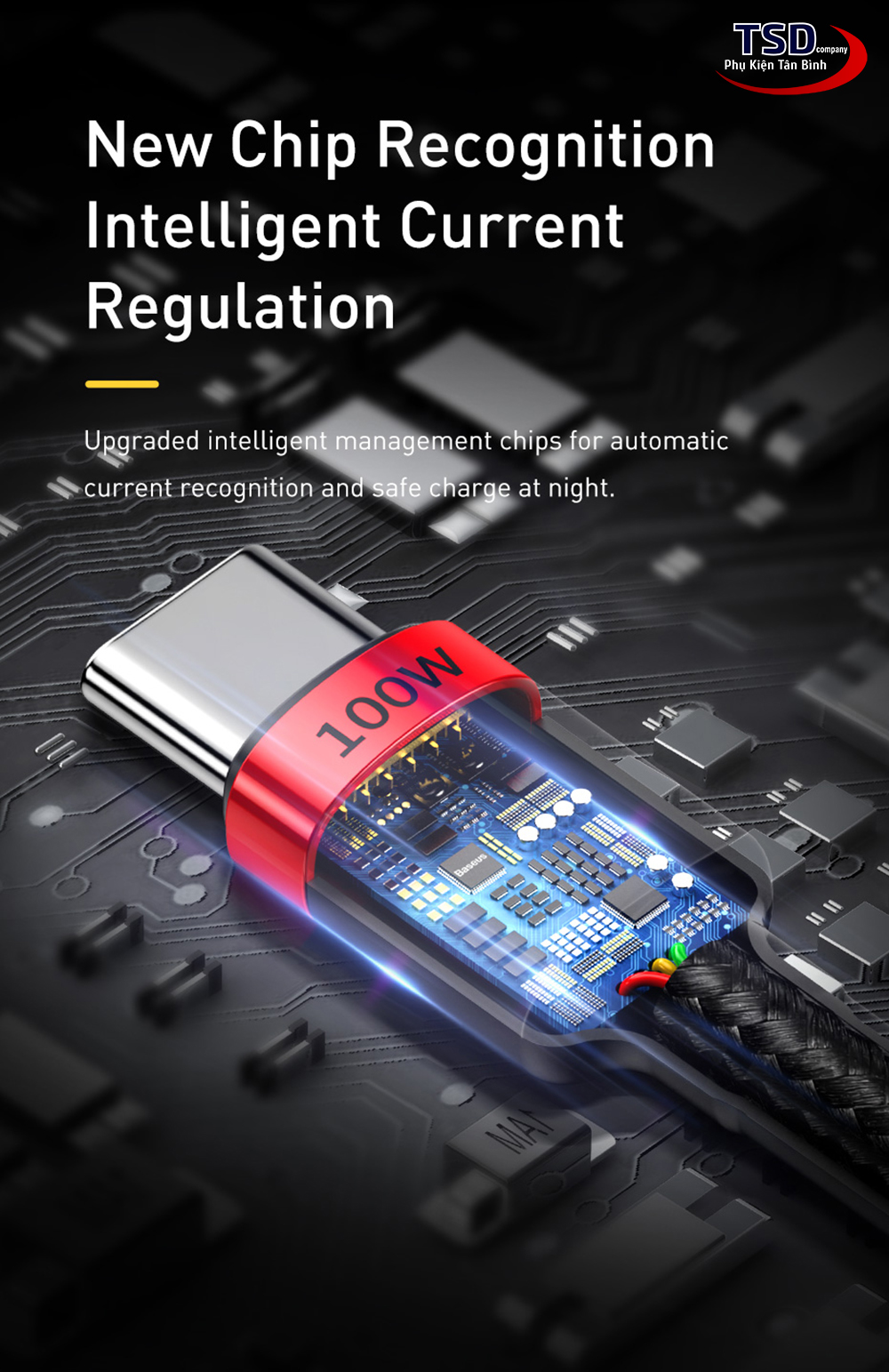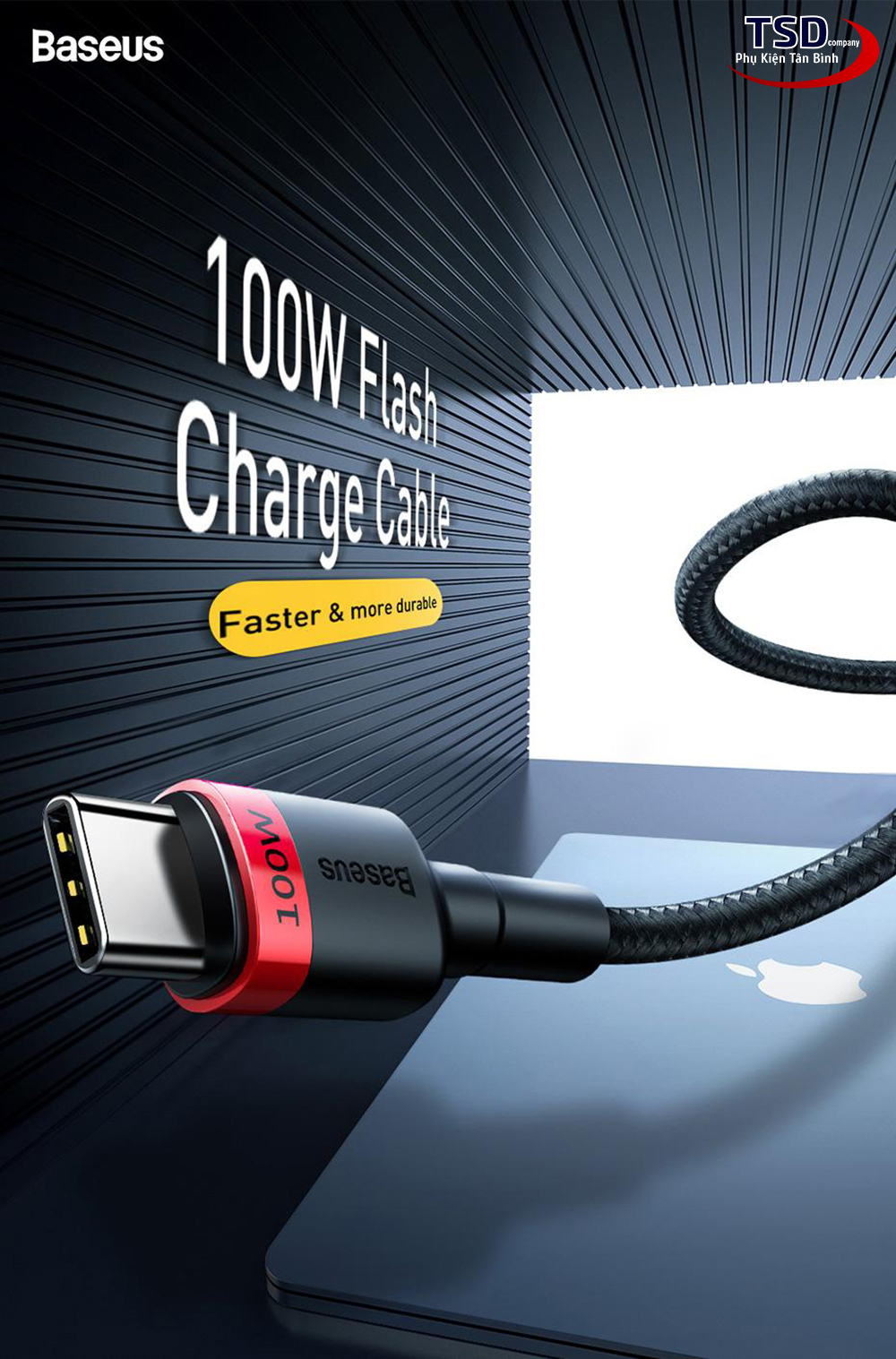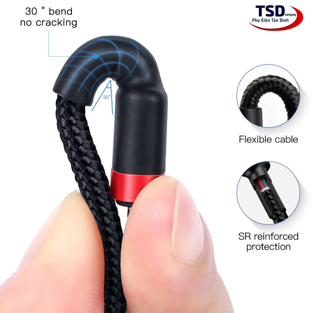 - Để tránh tình trạng bị gãy gập đầu cáp hãng Baseus đã dùng chất liệu TPE đúc nguyên khối đầu cáp dài khoảng 2 cm. Thiết kế thông minh, giúp tăng cường bảo vệ đầu cáp khỏi hư hỏng do sử dụng hàng ngày.