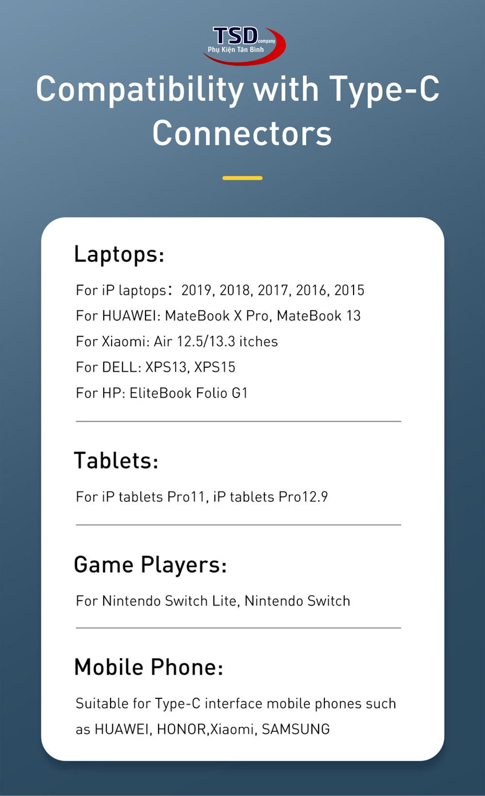 Sản phẩm tương thích với nhiều thiết bị như Apple MacBook ; Google Chromebook; Pixel (2015); OnePlus 2; Nexus 5X; Nexus 6P; Huawei MateBook; LG G5; LG V20; Google Pixel, Xiaomi ….