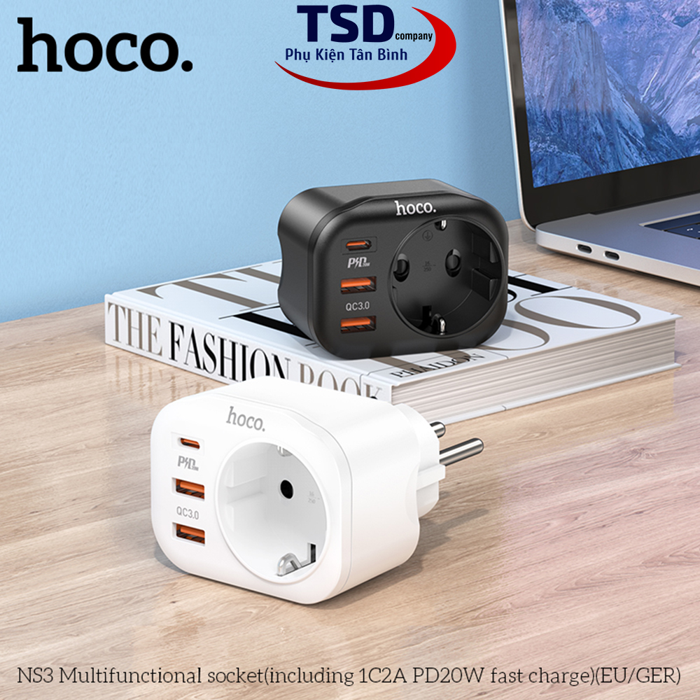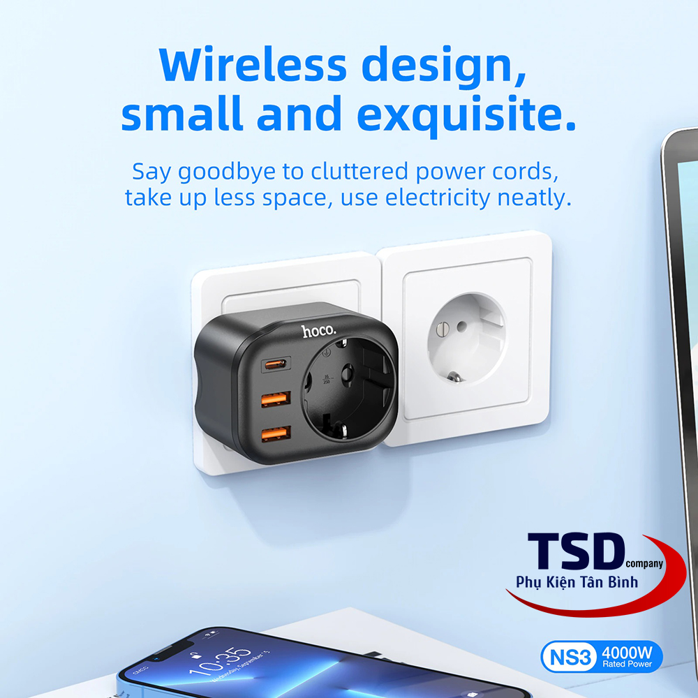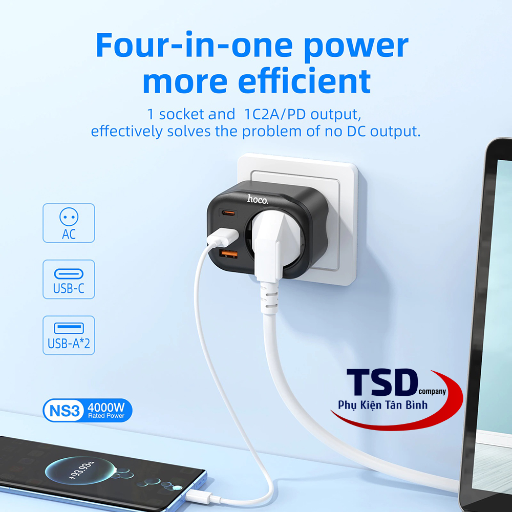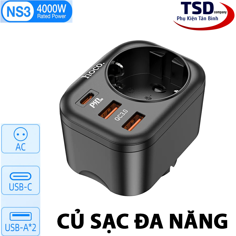 - Củ sạc kiêm ổ cắm thông minh hoco ns3 dùng cho điện thoại, máy tính bảng… và các thiết bị điện dân dụng khác.