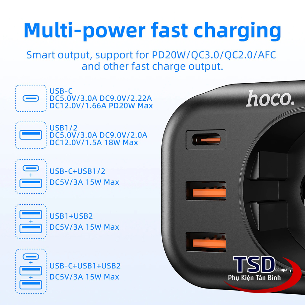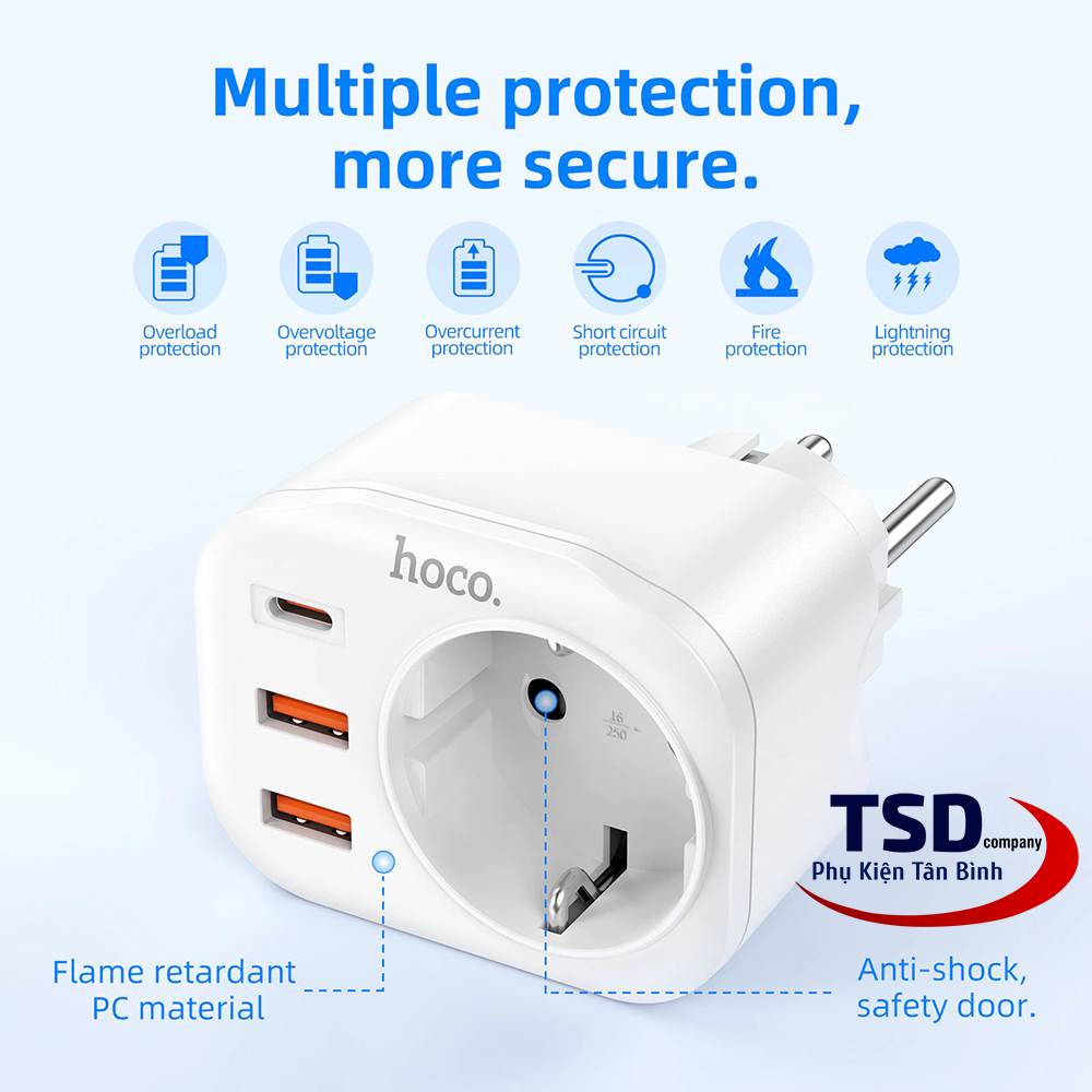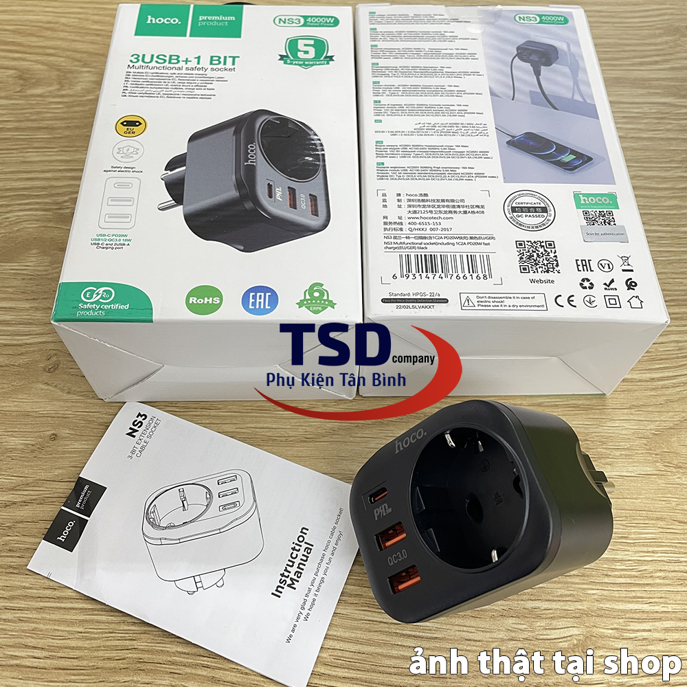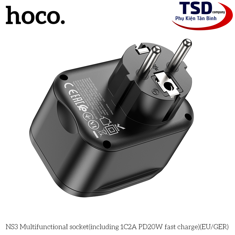 - Củ sạc kiêm ổ cắm thông minh hoco ns3 dùng cho điện thoại, máy tính bảng… và các thiết bị điện dân dụng khác.