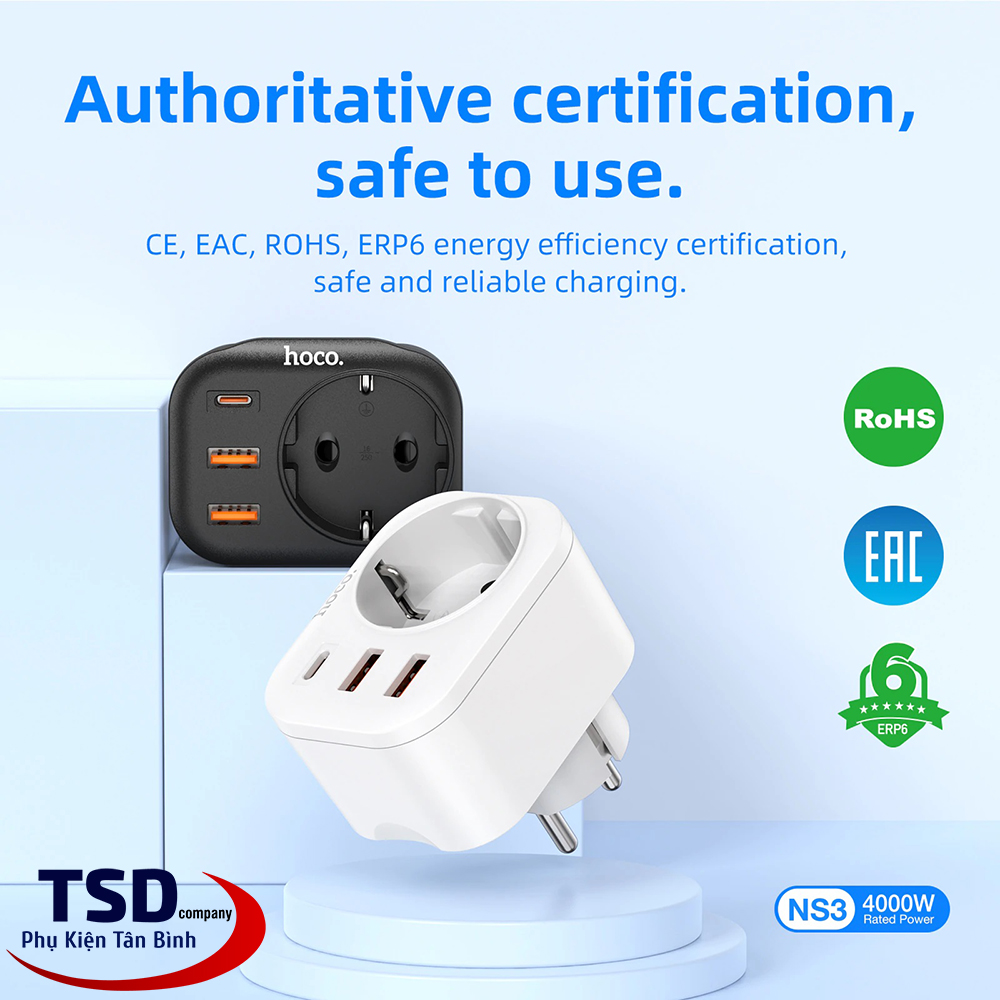 - Một bộ sạc thực sự an toàn: Chứng nhận RoHS, EAC mà Hoco NS3 có được cho thấy sự an toàn luôn được đặt lên hàng đầu và đây thực sự là một bộ sạc an toàn với khả năng bảo vệ các thiết bị điện tử của bạn khỏi tình trạng sốc điện đột ngột trong quá trình sạc.