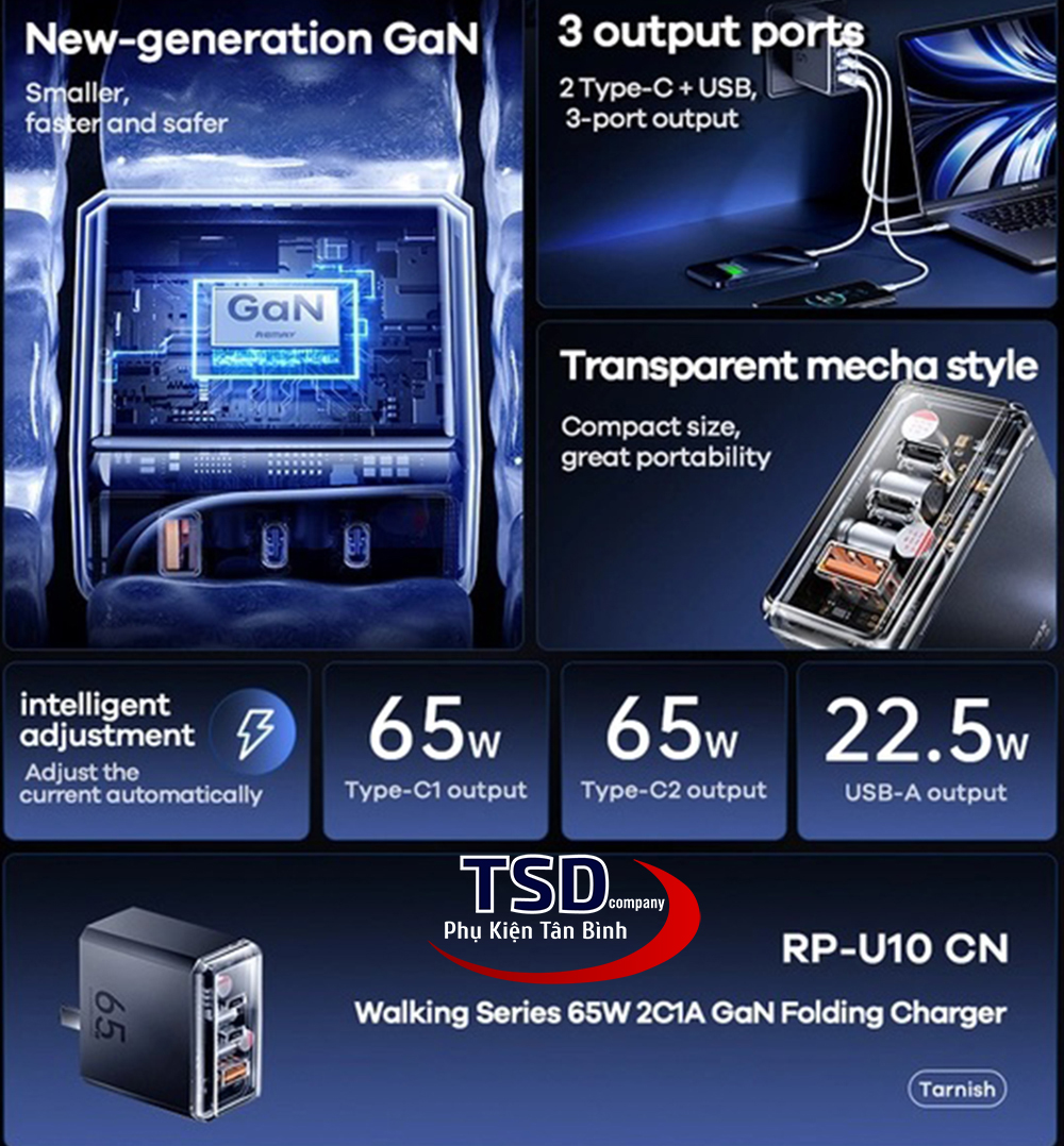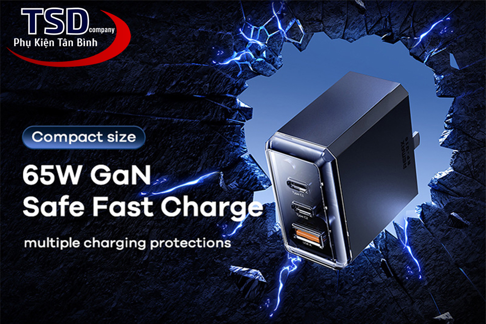 Công suất 65W, sạc nhanh điện thoại và laptop
