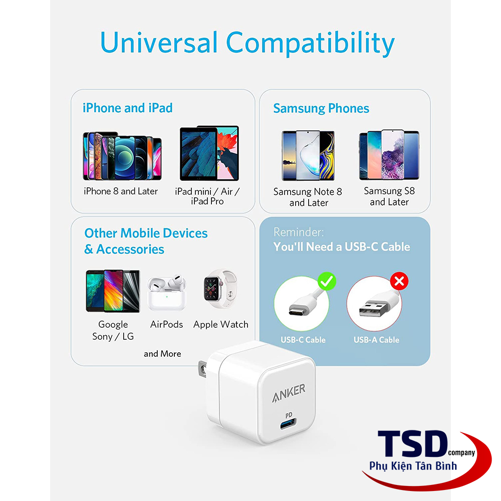 Củ Sạc Nhanh Anker PD 20W Powerport III A2149 có độ tương thích khá cao khi có thể sạc được cho cả iPhone và iPad. Bên cạnh đó, với việc sở hữu thông số đầu vào 100-240V thì cốc sạc 20W này còn có phạm vi sử dụng rộng rãi ở hầu hết các khu vực trên thế giới, do đó người dùng có thể thoải mái sử dụng sản phẩm trong những chuyến đi du lịch hay đi công tác xa.