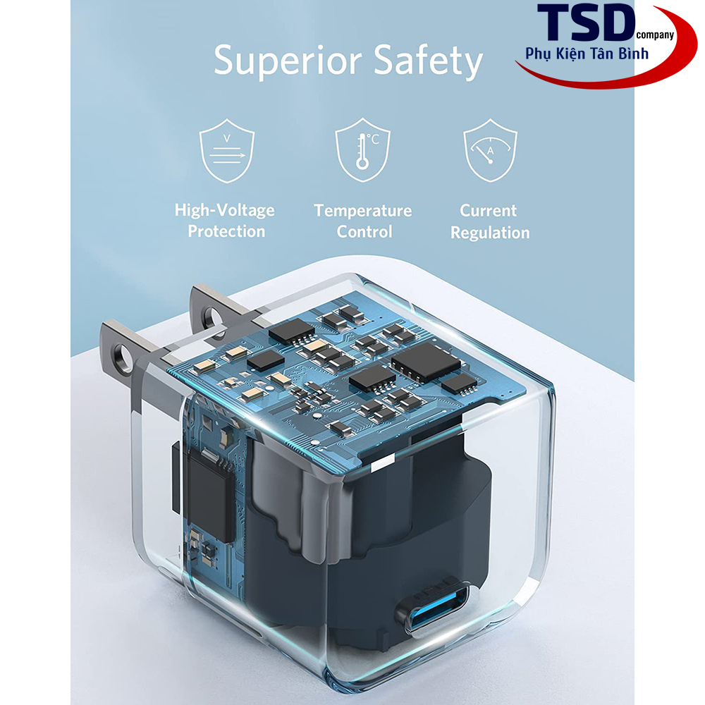 Ngoài ra, củ sạc cũng được hỗ trợ đầy đủ các trang bị an toàn để bảo vệ toàn diện cho người dùng và các thiết bị sạc như bảo vệ quá áp, ngắn mạch, quá nhiệt, tĩnh điện, quá dòng,...