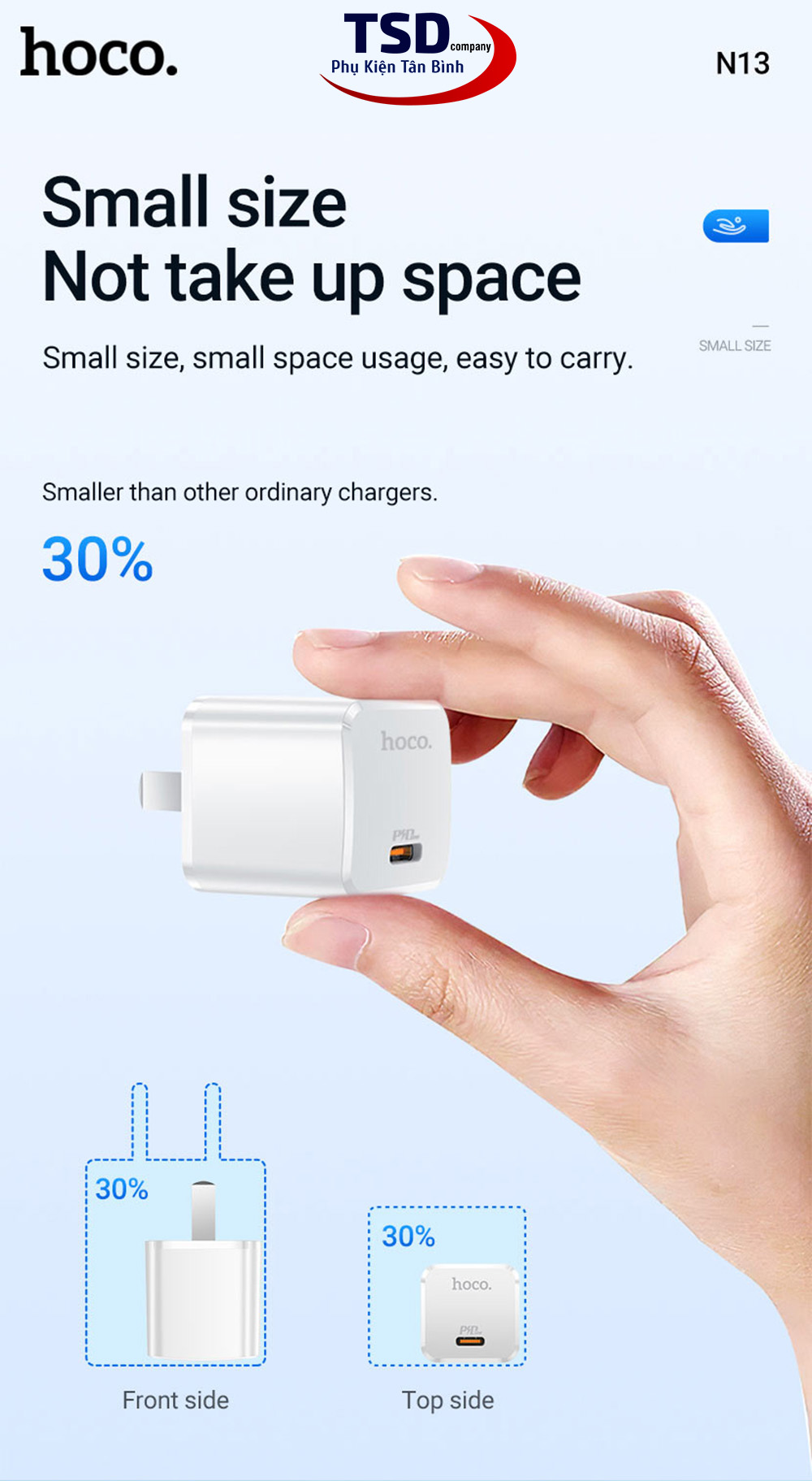 Sạc Hoco N13 PD 20W người dùng có thể dễ dàng mang theo bất cứ đâu. Giúp người sử dụng có thể để ở bất kỳ vị trí nào trong balo hay túi xách mà không bị chiếm nhiều không gian.
