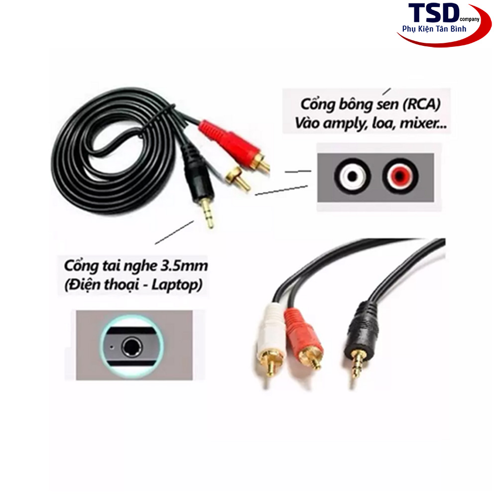 - Cáp chuyên dùng để kết nối từ cổng âm thanh loa 3.5mm của máy tính, điện thoại và tất cả thiết bị phát âm thanh bằng cổng 3.5 sang 2 đầu trắng /đỏ RCA, rắc hoa sen của loa, âm ly hoặc 1 số thiết bị chuyên dụng khác.