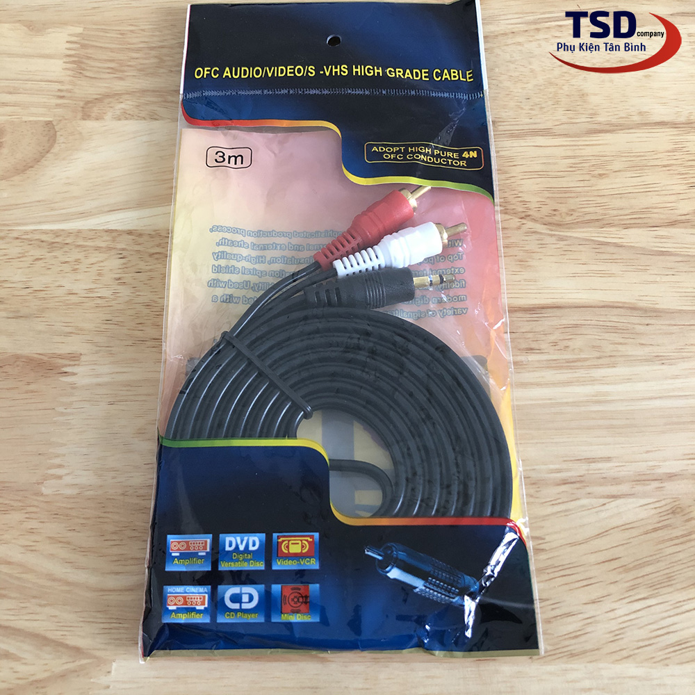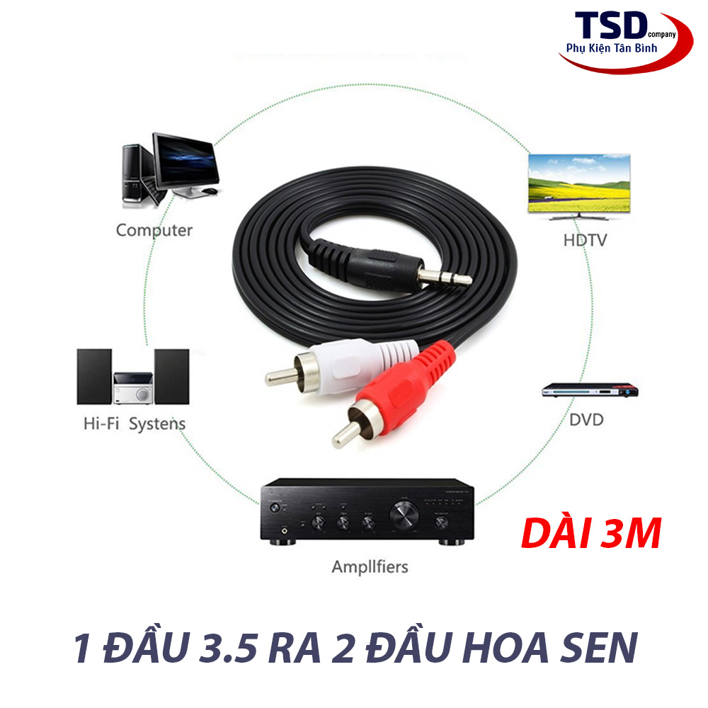 Cáp nối dài dây loa 1 đầu 3.5mm ra 2 đầu hoa AV hoa sen dài 3m được sử dụng trong hệ thống âm thanh gia đình khi muốn đưa tín hiệu âm thanh từ thiết bị điện tử ví dụ như tivi, điện thoại ra các thiết bị âm thanh như amply, đầu đĩa, loa hoặc từ điện thoại di động lên tivi.