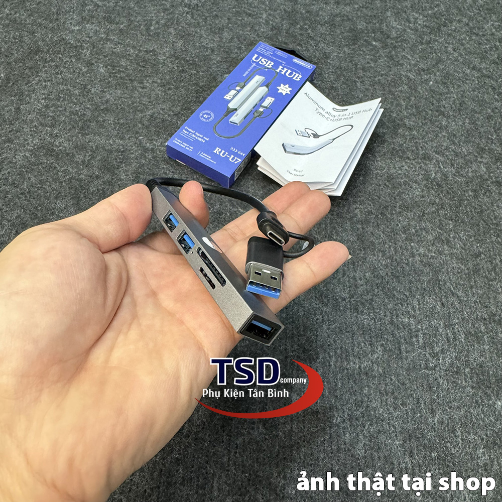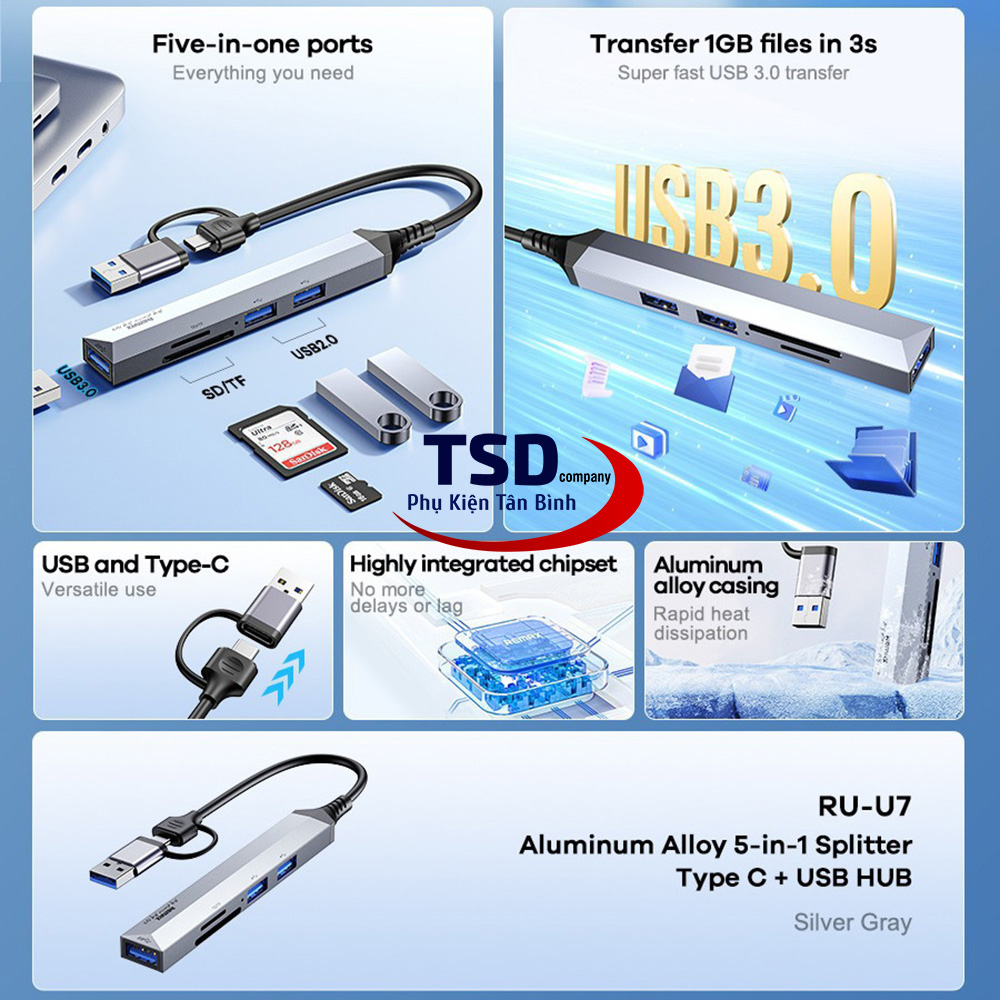 Hub USB Remax RU-U7 với 2 cổng USB 2.0, 1 cổng USB 3.0, 2 khe cắm thẻ nhớ. Remax RU-U7 hỗ trợ chia cổng usb hoặc type-c trên máy tính thành 3 cổng usb trên hub & 2 khe cắm thẻ nhớ. Ngoài việc hỗ trợ truyền dữ liệu thì Hub còn giúp bạn kết nối với những thiết bị sử dụng cổng USB khác. Như quạt tản nhiệt, USB, chuột, lót chuột rgp, fan mini, đầu đọc thẻ nhớ…