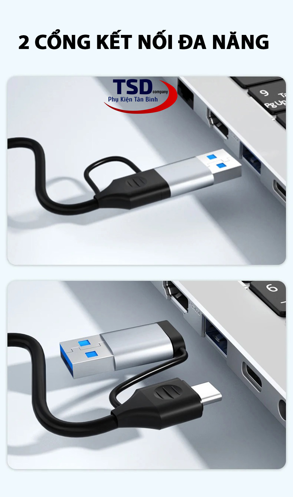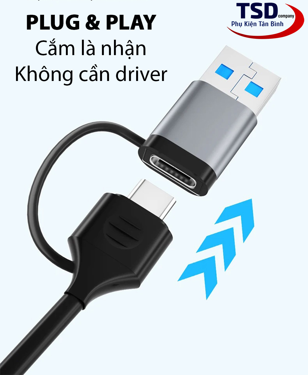 Bạn thường gặp khó khăn trong việc chuyển đổi giữa các thiết bị với các đầu cổng khác nhau, từ 1 sợi cáp cổng USB & Type - C có thể giúp bạn kết nối với nhiều loại cổng như USB, SD/TF (đầu cắm thẻ nhớ) và cả Micro SD.