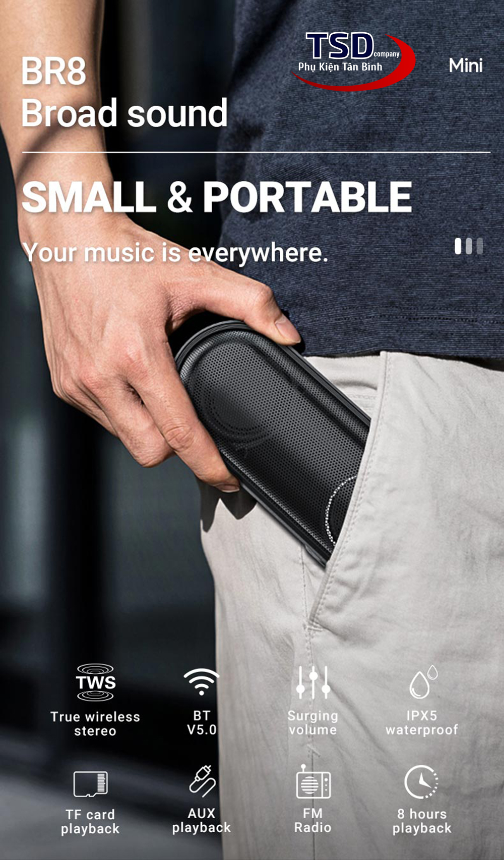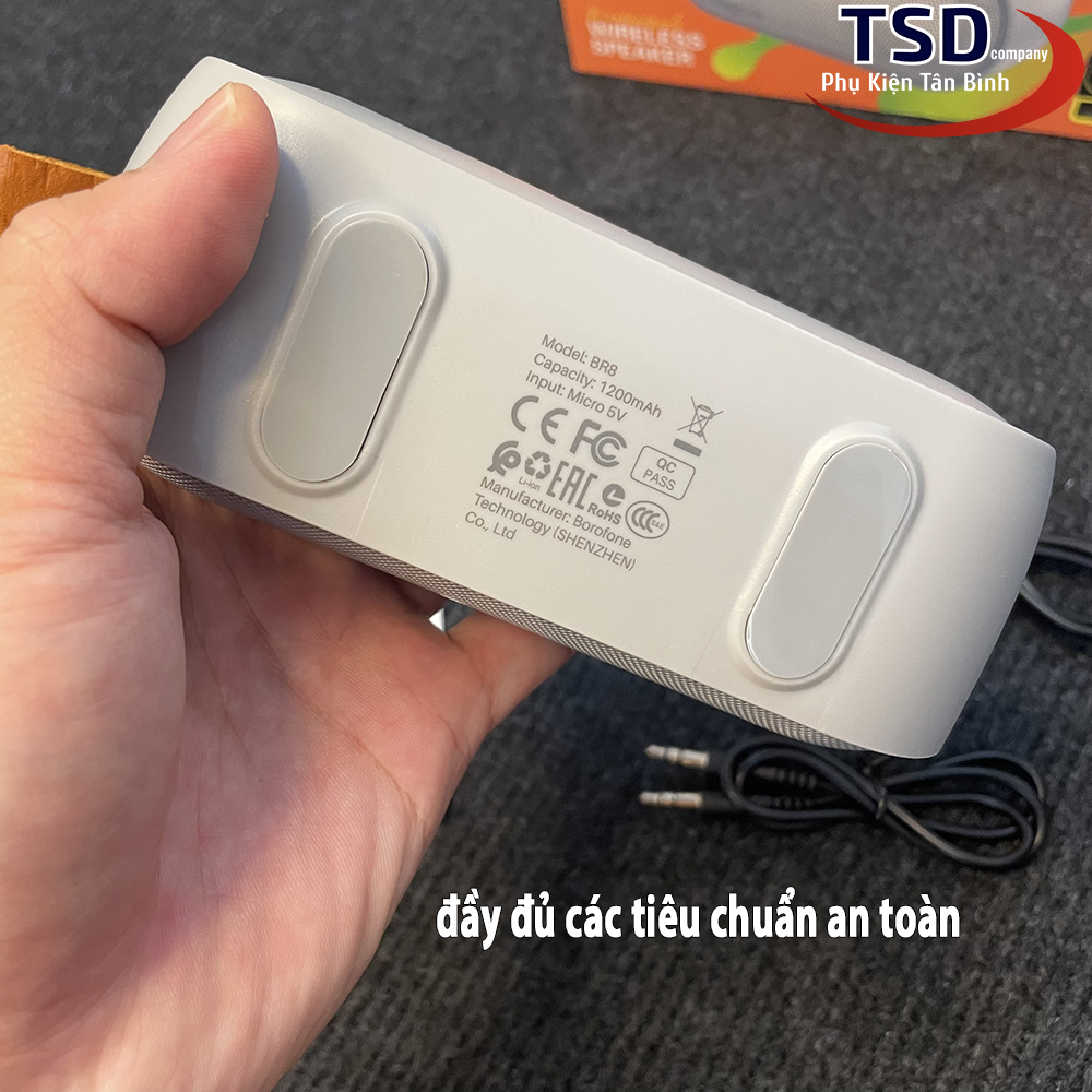 Loa Bluetooth BR8 được trang bị pin lên đến 1200mAh cho bạn thời gian nghe nhạc lên đến 5 giờ và thời gian nói chuyện điện thoại lên đến hơn 5 giờ. Trong khi thời gian sạc chỉ mất 2 giờ là bạn đã có thể thoải mái sử dụng loa với nhiều mục đích khác nhau rồi.