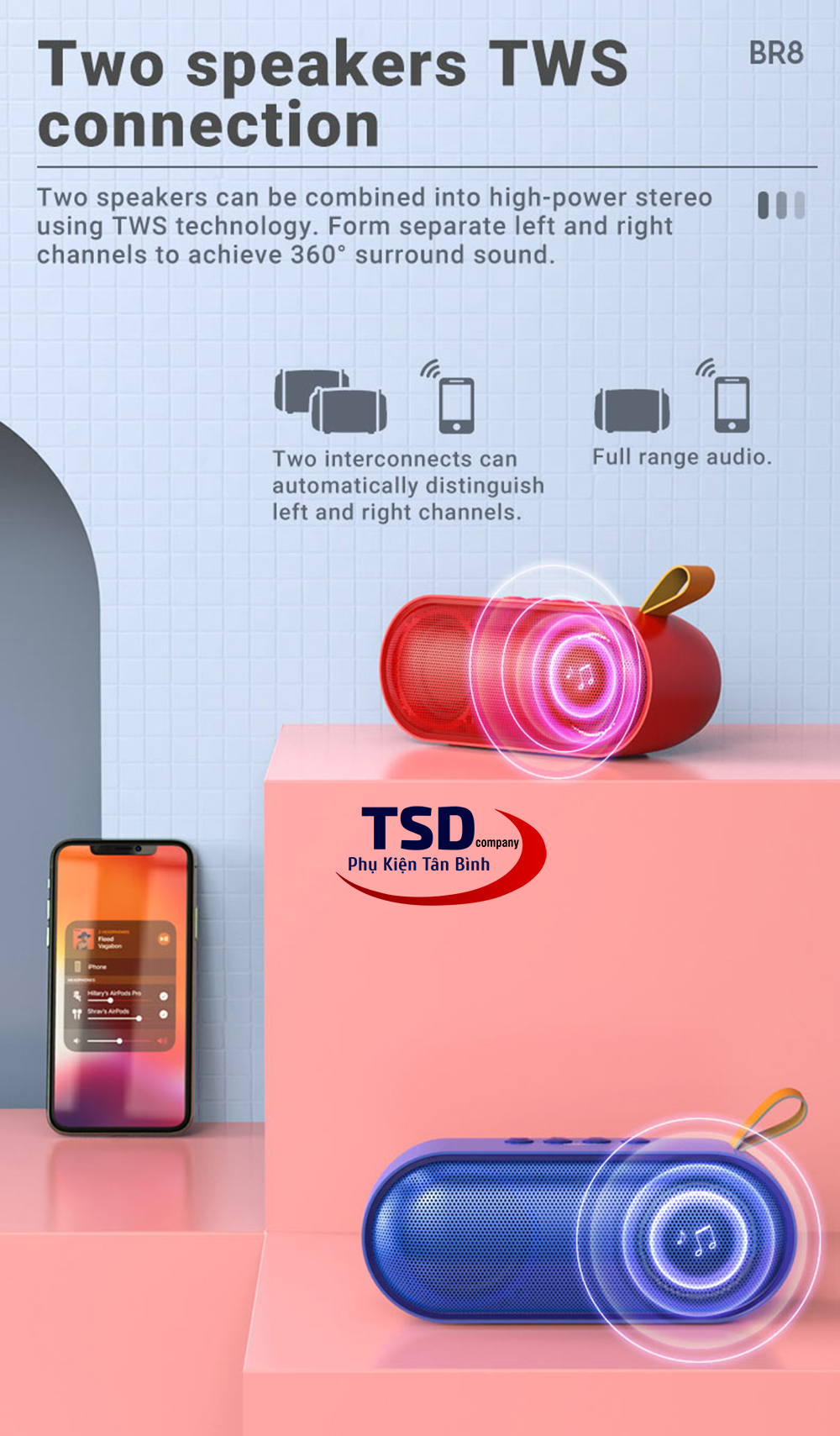 Chức năng: hỗ trợ mở nhạc và lặp lại bài, gọi điện, thẻ nhớ TF, USB, AUX, TWS, FM playback mode.