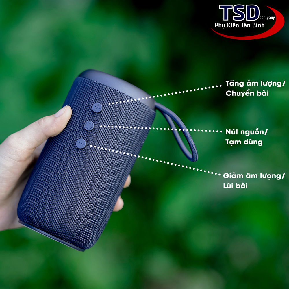 - Các nút chức năng được bố trí nổi ngay trên bề mặt loa để người dùng dễ dàng thao tác và sử dụng. Loa bao gồm 3 nút Tăng âm lượng, Bật / Tắt nguồn, Giảm âm lượng.