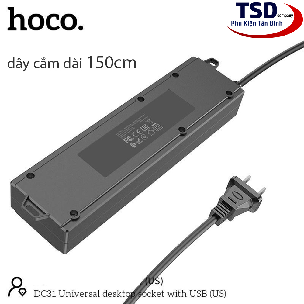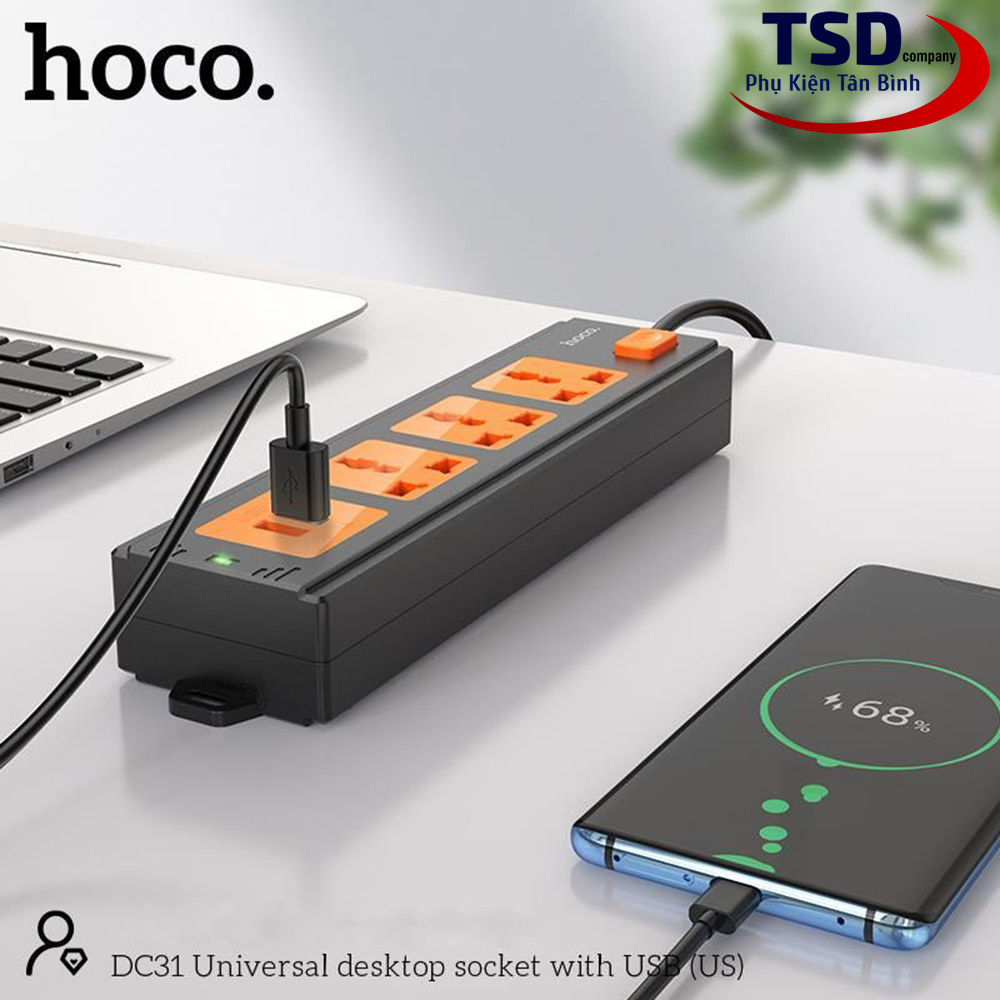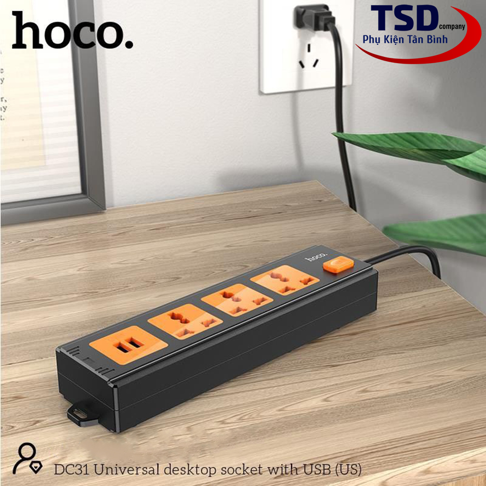 Thiết kế ổ cắm đa năng, tiện dụng, 1 ổ cắm Hoco DC31 sở hữu 3 ổ cắm điện thông thường và 2 cổng USB tha hồ cho bạn có thể sử dụng các thiết bị khác nhau.