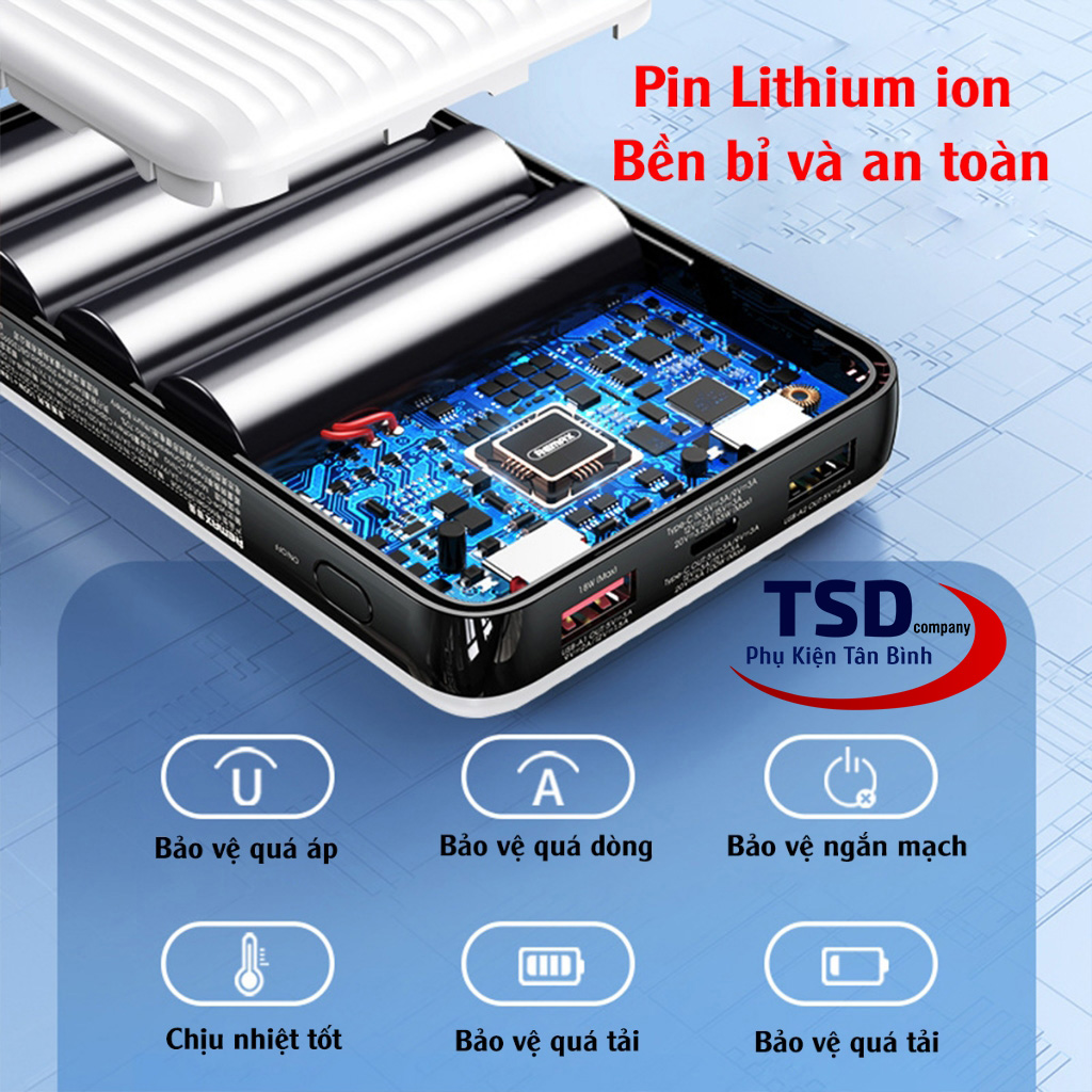 Remax RPP-508 sử dụng lõi pin Lithium-ion cao cấp giúp duy trì chất lượng bền bỉ với vòng đời sử dụng lâu dài. Ngoài ra, sản phẩm còn được trang bị các công nghệ bảo vệ như bảo vệ quá điện áp, bảo vệ quá dòng, bảo vệ ngắn mạch, bảo vệ nhiệt độ, bảo vệ quá tải và bảo vệ xả quá mức nhằm đảm bảo an toàn cho người dùng và thiết bị trong quá trình sử dụng.
