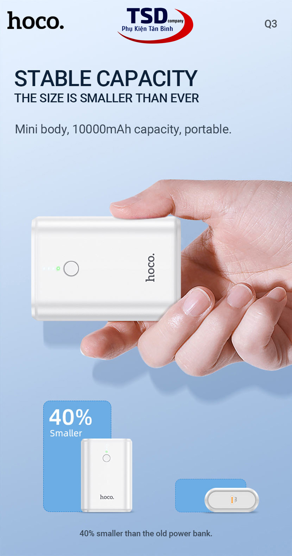 Với thiết kế cực kì nhỏ gọn nhưng Hoco Q3 PD 20w vẫn mang trong mình dung lượng 10,000mAh, đảm bảo đại đa số nhu cầu, có thể sạc 3 lần cho smartphone. Tương tự với các loại pin sạc dự phòng khác, việc sạc nhanh là yêu cầu cấp thiết của người dùng khi sử dụng sạc dự phòng. Hoco Q3 PD 20W với dòng đện đầu ra là 3A giúp thiết bị sạc nhanh hơn.