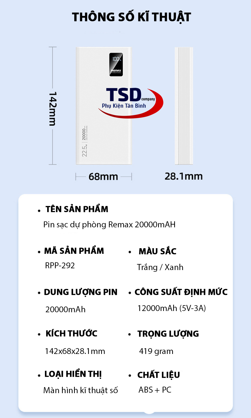- Pin sạc dự phòng Remax RPP-292 sở hữu ngoại hình thon gọn với kích thước 142 x 68 x 28.1mm cùng trọng lượng 418g. Mặc dù không nhỏ nhắn nhưng cầm tay khá vừa vặn, chắc chắn mà không quá cồng kềnh. Toàn bộ các chi tiết đều được hoàn thiện tỉ mỉ, các góc hay cạnh viền đều được bo cong mềm mại mang đến sự cao cấp và hiện đại hơn.