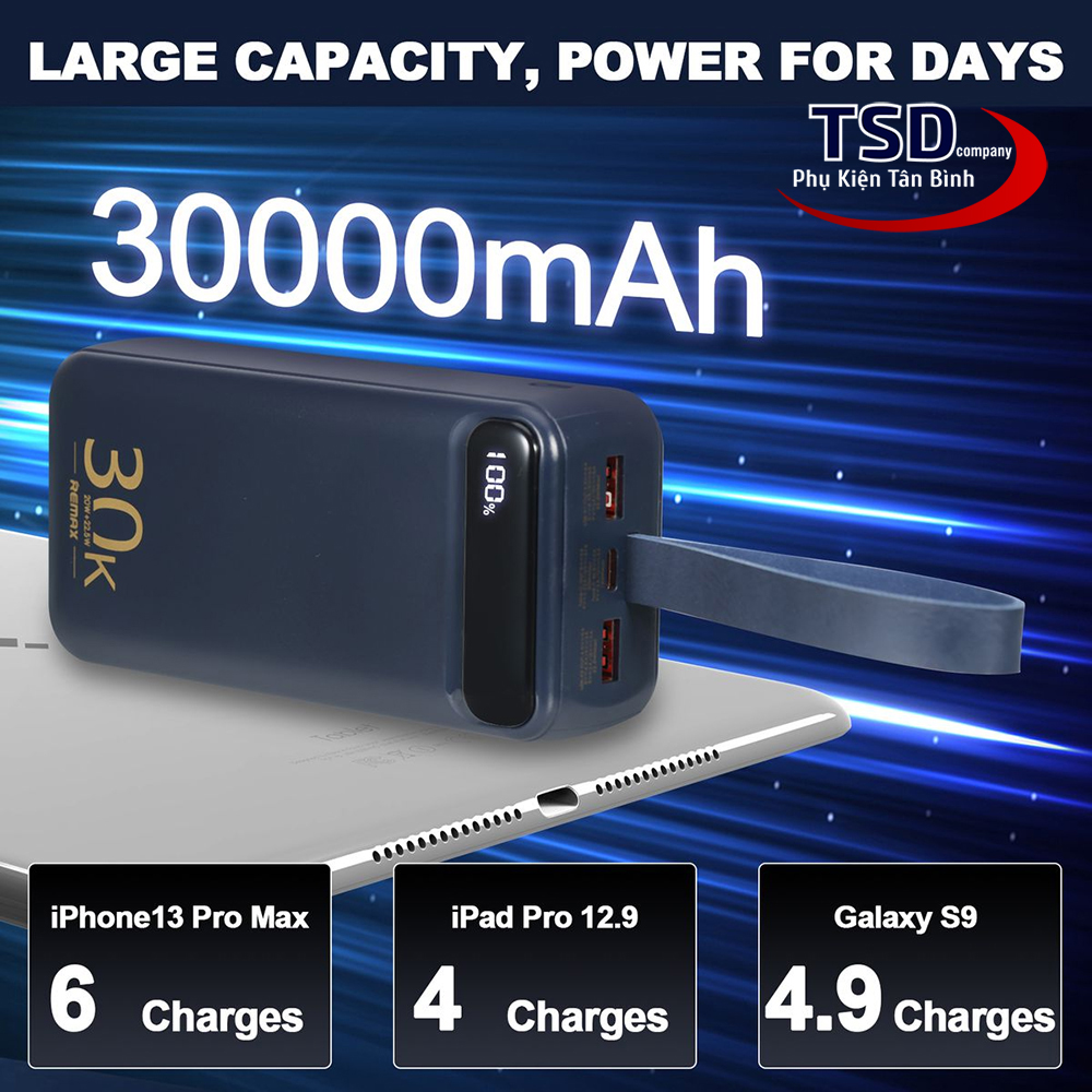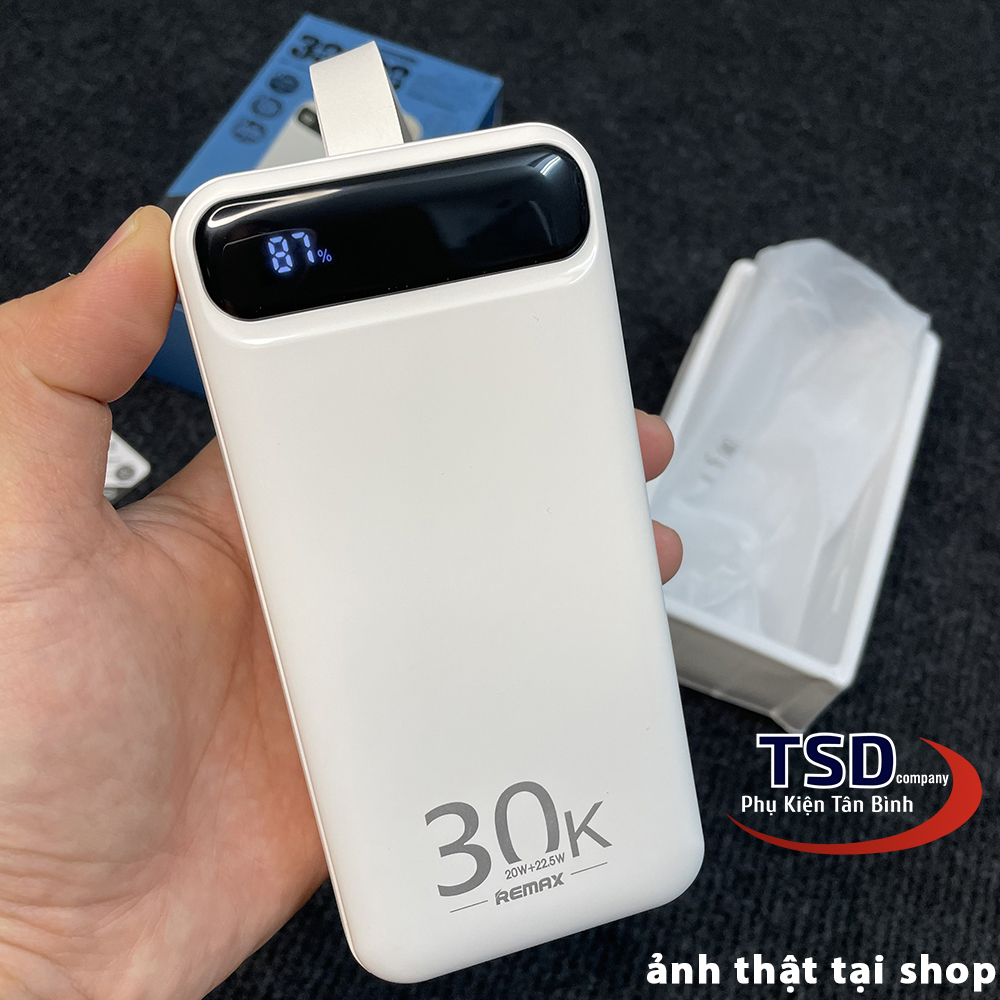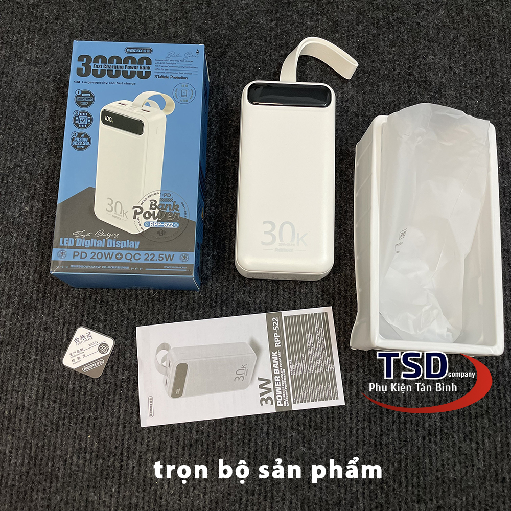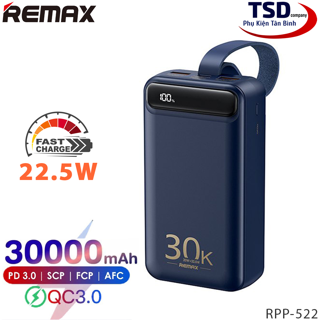 - Remax RPP-522 là dòng pin sạc dự phòng 30000mAh với thiết kế đầu ra 2 cổng USB & 1 cổng Type C cho khả năng sạc 3 thiết bị cùng lúc với nguồn ra tối đa lên đến 22.5W.