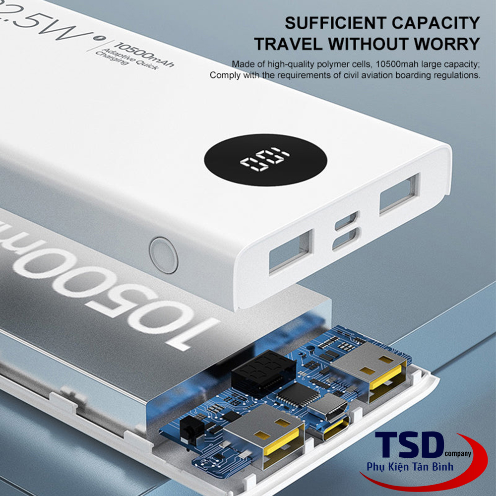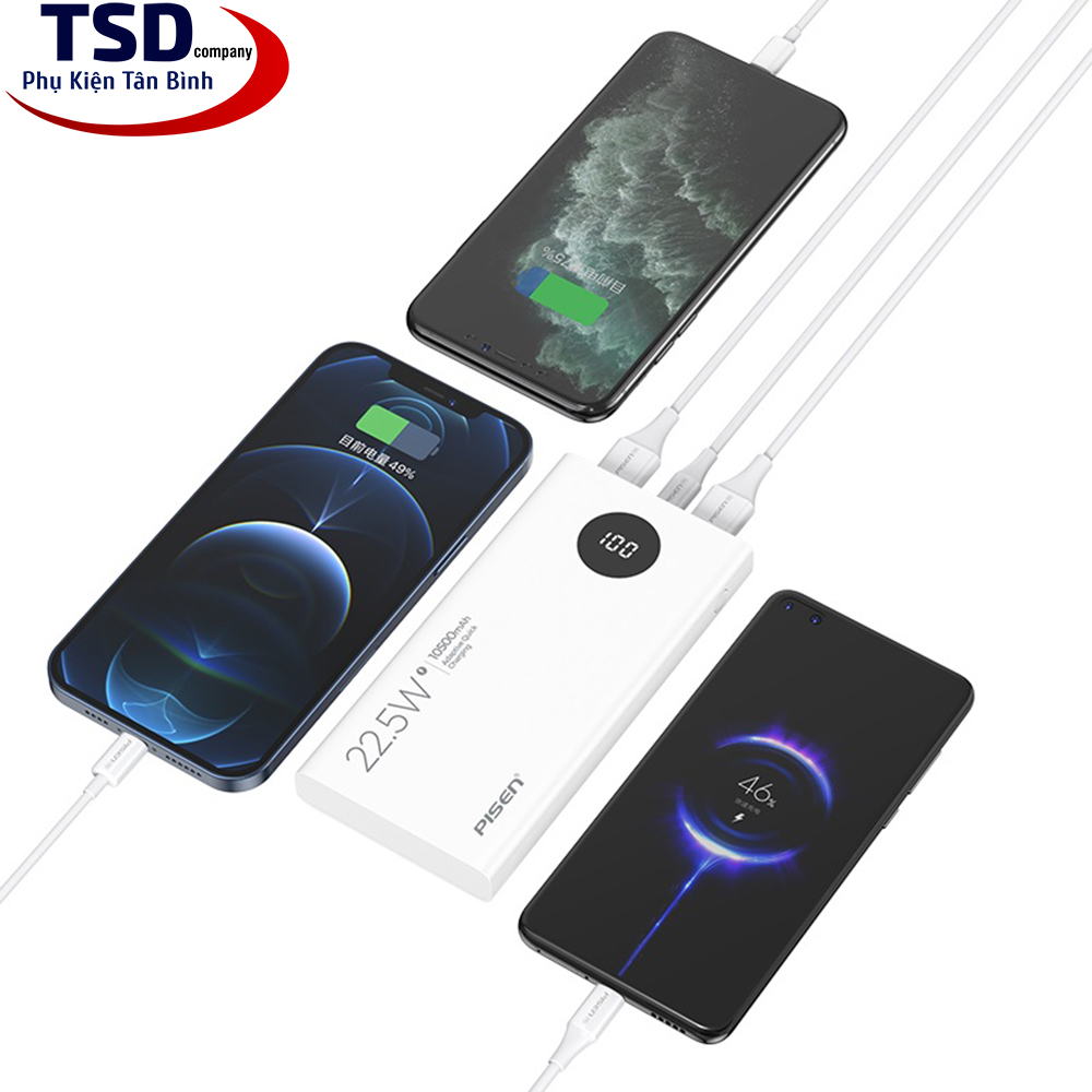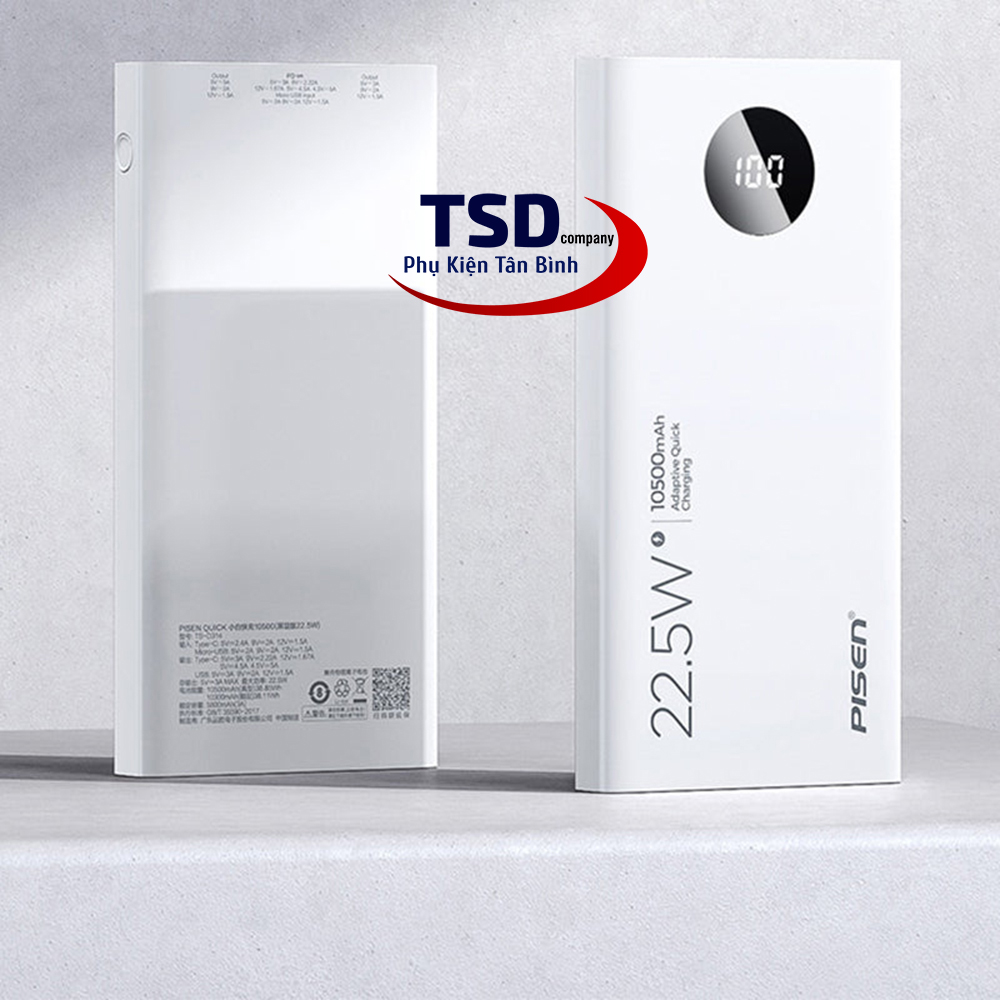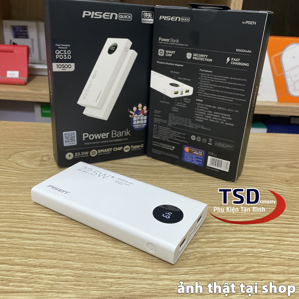 Sạc Dự Phòng Pisen QUICK PowerU 10500 mAh (LED ) Ultra 22.5W TS-D314 là thiết bị Pin dự phòng cao cấp hãng Pisen có dung lượng cao đến 10500 mAh. Pin được sản xuất và tương thích với các thiết bị đa dạng thiết bị & hỗ trợ sạc nhanh lên đến 22.5W.