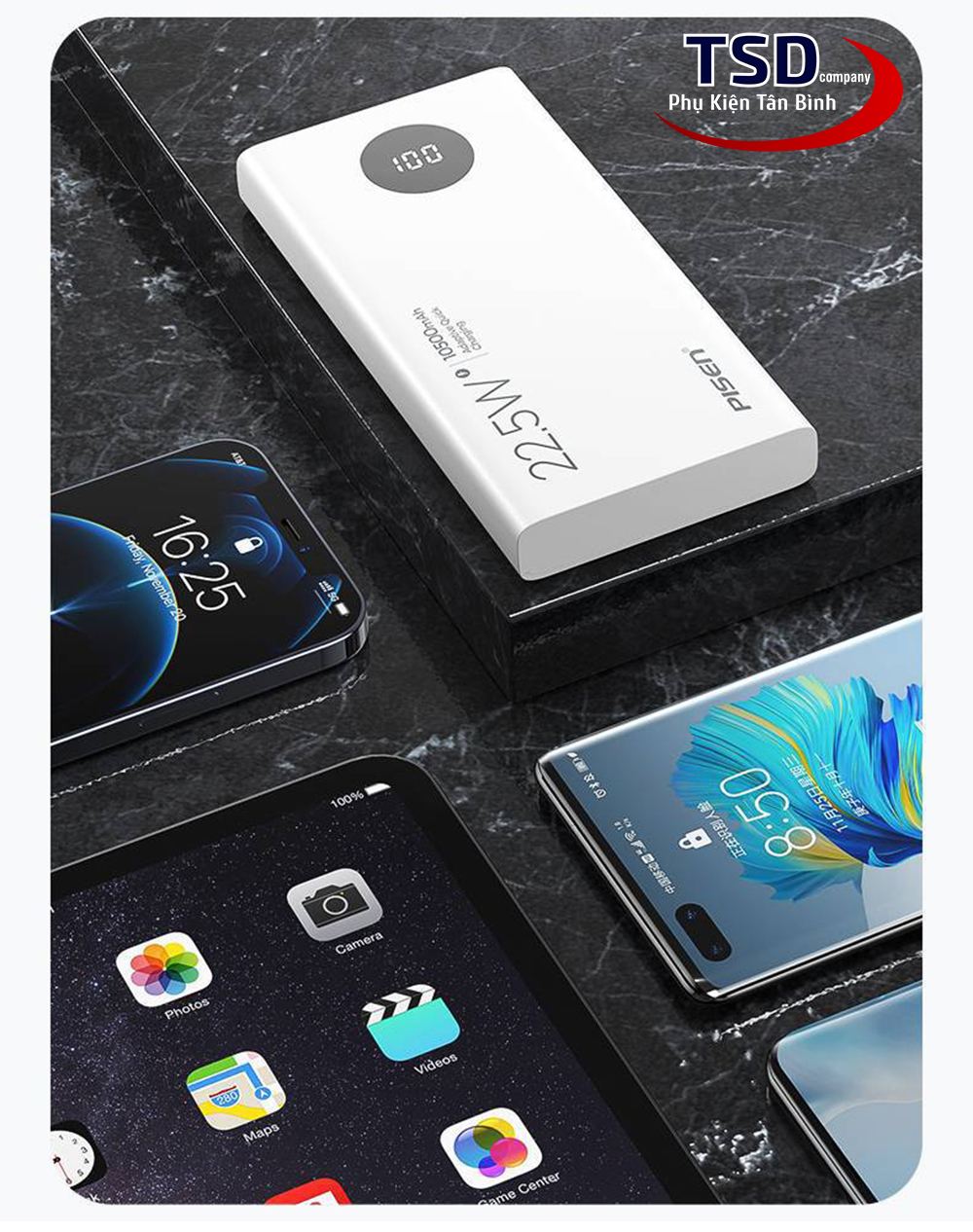 Sạc nhanh 2 chiều PD22.5W, sạc đồng thời 3 thiết bị.