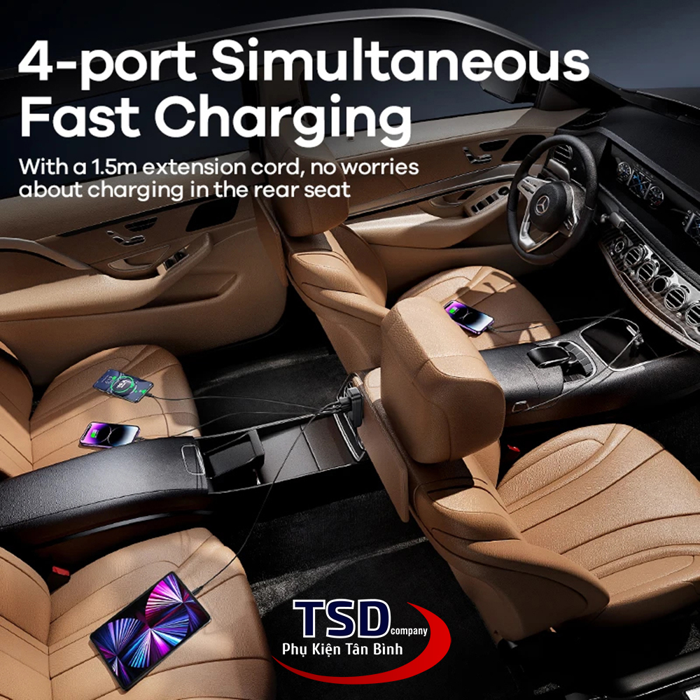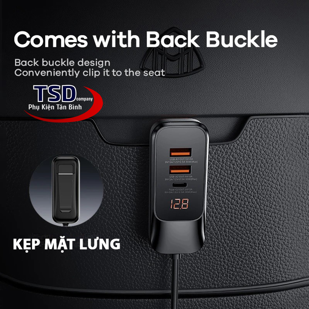 - Thiết kế này vô cùng tiện ích với những chiếc xe ô tô không có cổng sạc phía sau. Bạn chỉ cần kẹp vào túi đựng đồ sau ghế để cố định và cắm sạc như bình thường. Với chiều dài sợi cáp lên đến 1.5 mét cho khoảng cách kết nối không giới hạn và vướng víu khi sạc trên ô tô.