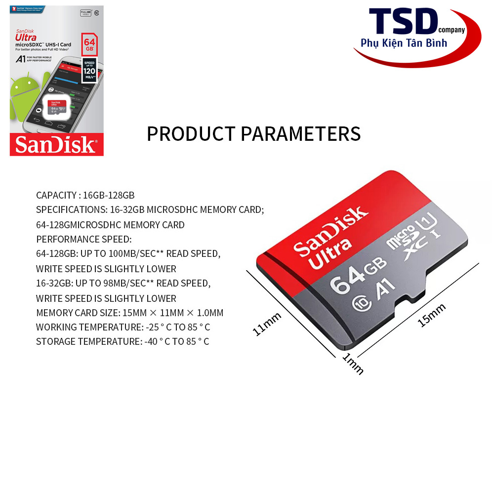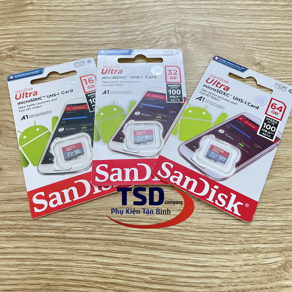 Thẻ nhớ MicroSD SanDisk Ultra A1 cho phép bạn lưu giữ, truyền tải hình ảnh có độ phân giải cao và video Full HD trên điện thoại thông minh Android hoặc máy tính bảng của bạn. Với dung lượng lên đến 64GB, thẻ nhớ MicroSD SanDisk Ultra A1 có thẻ lưu trữ rất nhiều album hình ảnh độ phân giải cao và quay video Full HD. Với tốc độ chuẩn Class 10 để quay video Full HD và tốc độ đọc lên đến 100MB/s để chuyển file cực nhanh. Thẻ nhớ MicroSD SanDisk Ultra A1 không thấm nước, chống thấm, chống nhiệt, chống sốc, chống tia x-ray, và chống từ trường.