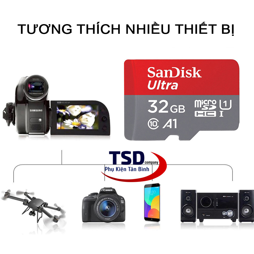 Thẻ nhớ MicroSD SanDisk Ultra A1 tương thích hoàn hảo với điện thoại thông minh, máy tính bảng, camera,.... ngoài ra thẻ này cũng tương thích tuyệt đối với các dòng máy ảnh dùng thẻ nhớ nhỏ.