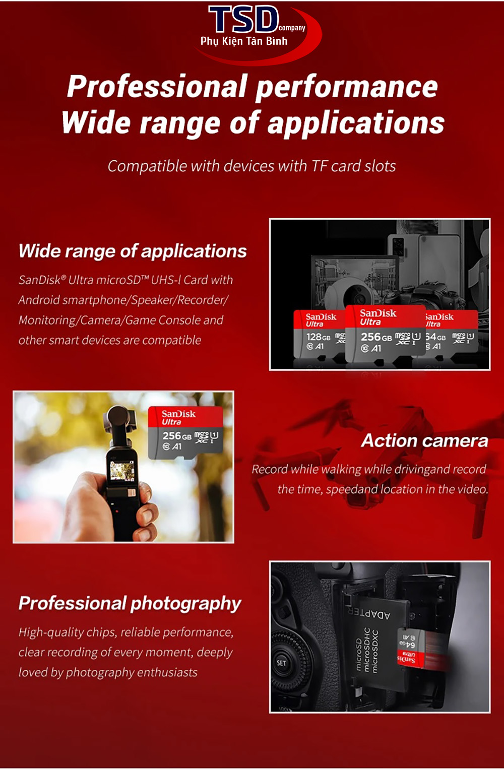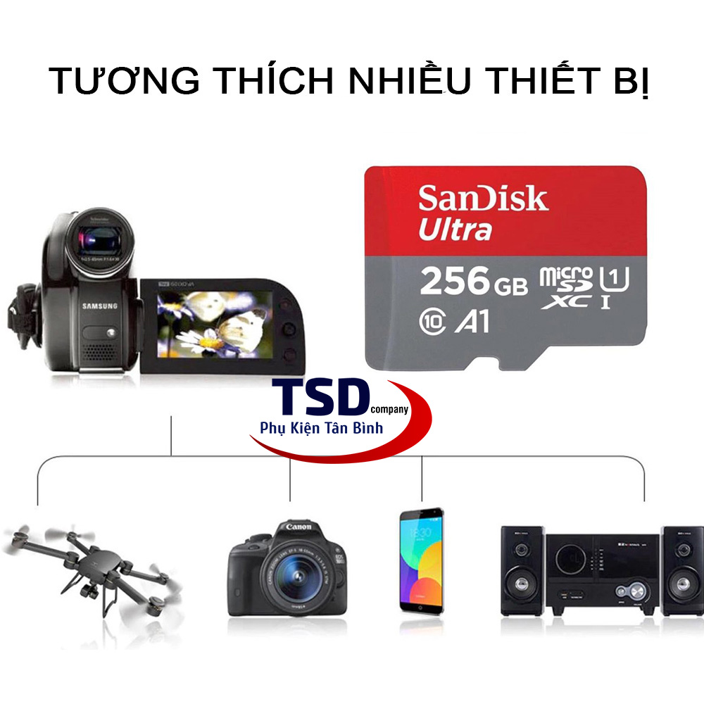 Thẻ nhớ MicroSD SanDisk Ultra tương thích hoàn hảo với điện thoại thông minh, máy tính bảng, camera,.... ngoài ra thẻ này cũng tương thích tuyệt đối với các dòng máy ảnh dùng thẻ nhớ nhỏ.